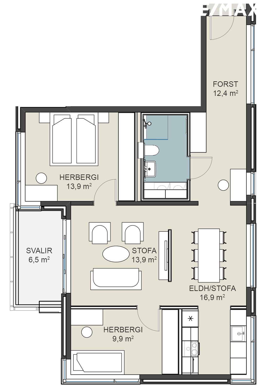 Stofa/borðstofa: Í samliggjandi rými með eldhúsi. Opið og bjart rými. Útgengt út á 6,5 fm svalir um góða rennihurð.
