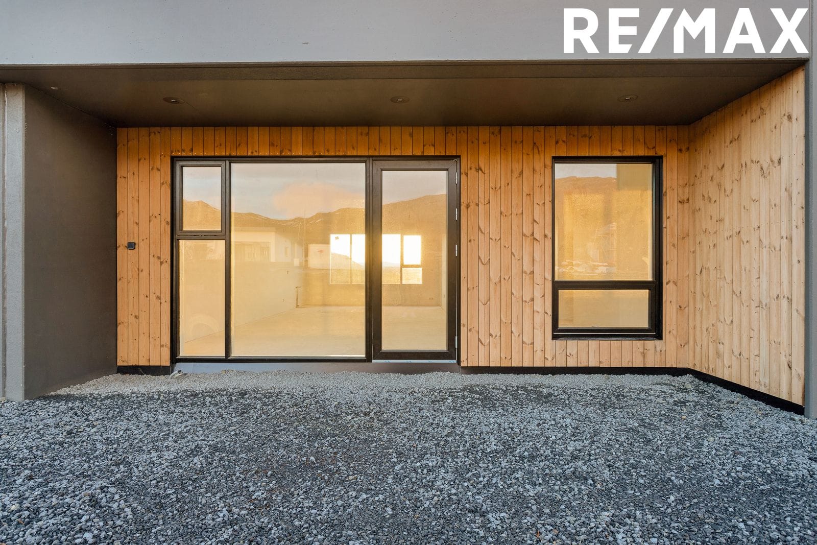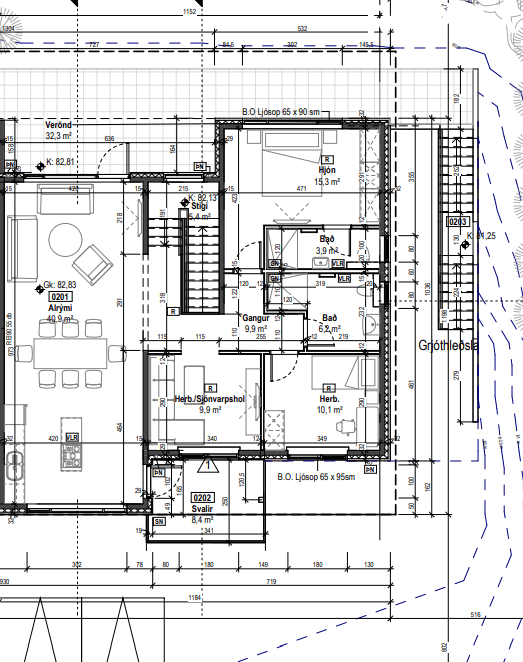 Gluggar og hurðir: Ál/tré gluggar með tvöföldu K-gleri, ál/tré inngangshurðar/svalahurðar og svört bílskúrshurð.