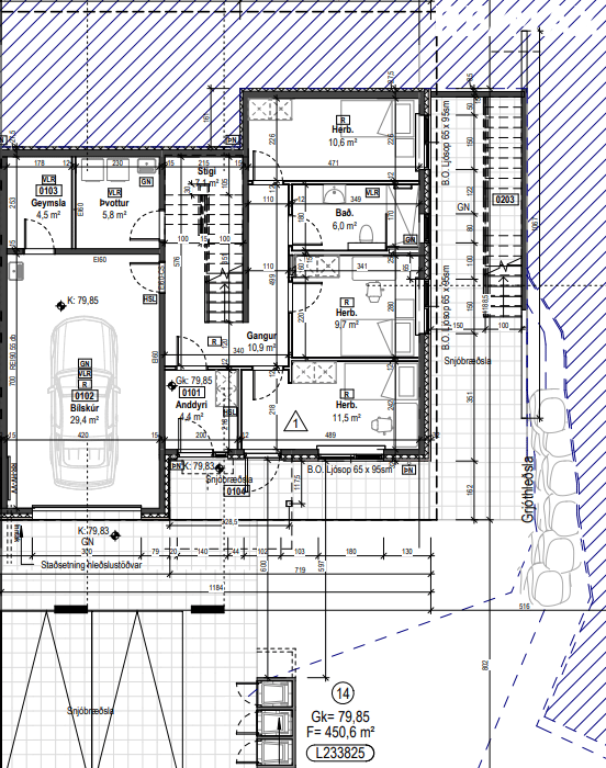 Lagnir: Frágangur neyslu og fráveitulagna er miðaður við samþykktar skipulagsteikningar. Inntak hita og neysluvatns klárt.