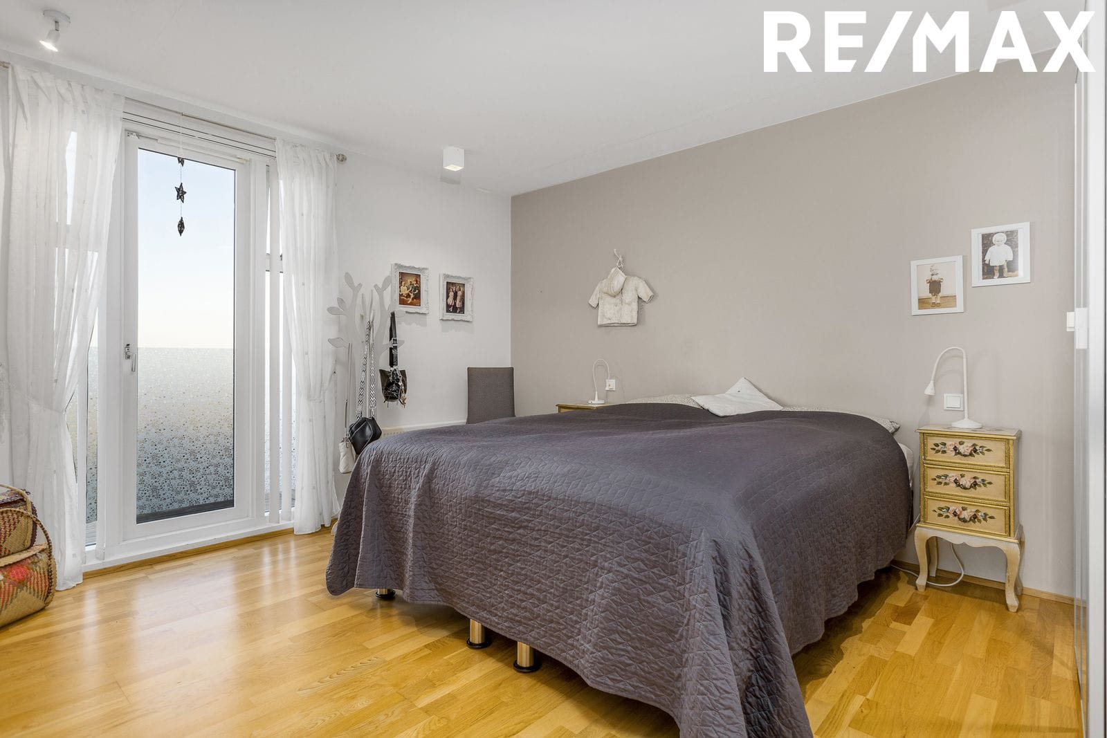 Hjónaherbergið er með fataskápum á tveim hliðum og útgengt út á pall með útsýni út á haf.