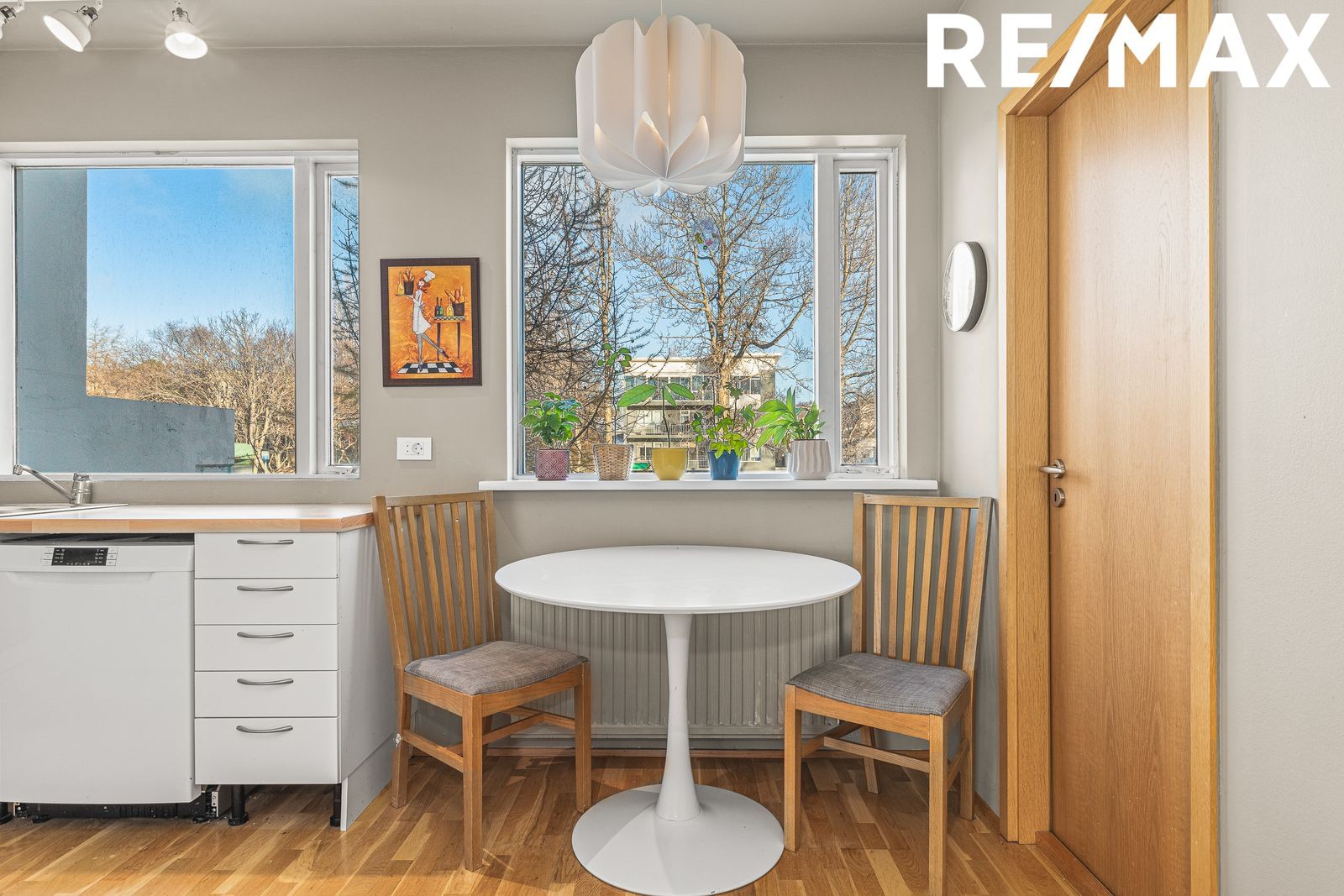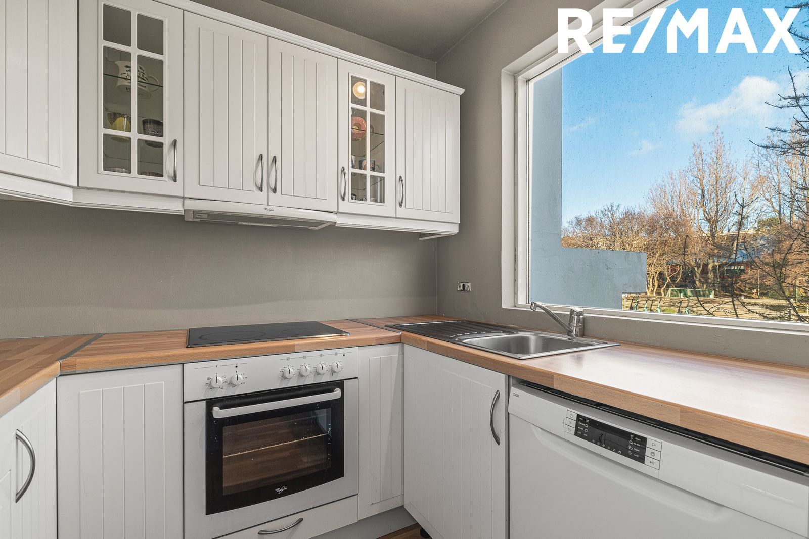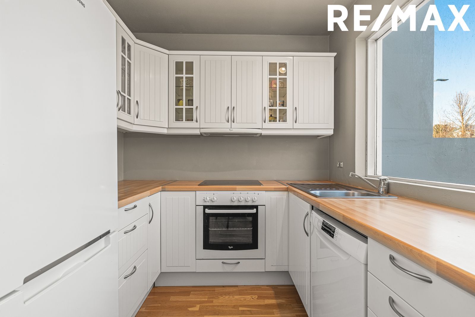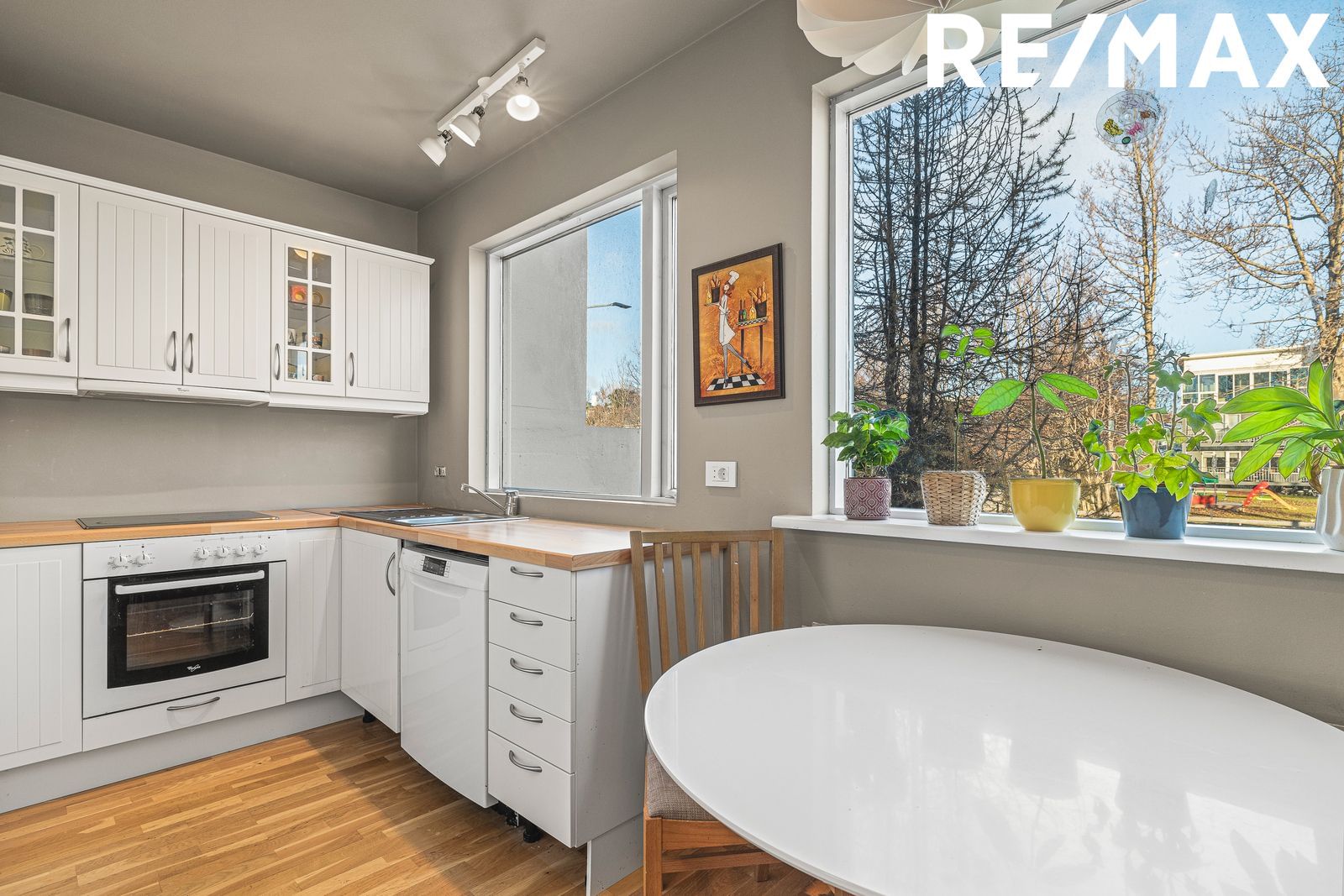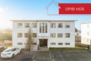 Nánari lýsing: Forstofa með flísum/parketi á gólfi. Stofa og borðstofa bjartar með parket á gólfi, útgengt á suður-svalir, útsýni. Eldhúsið er með IKEA innréttingu, helluborð, vifta, t.f. uppþvottavél, borðkrókur, parket á gólfi. Hjónaherbergi með góðum fataskáp, parket á gólfi, útgengt á suður-svalir, útsýni. Herbergi með parket á gólfi. Baðherbergi flísalagt í hólf og gólf, baðkar með sturtuaðstöðu, upphengt wc, t.f. handklæðaofn, gluggi, nýlega endurnýjað að mestu leyti. Þvottaherbergi bjart með gluggum á tvo vegu, málað gólf. Geymsla er sér á jarðhæð/kjallara. Sérmerkt bílastæði fyrir utan fyrir hverja íbúð og húsið er með tvö auka stæði sem ganga inn í garðinn.