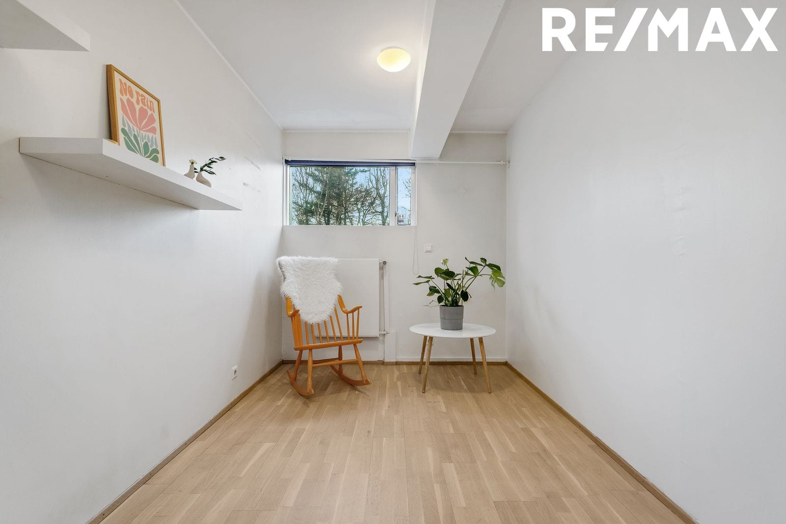 Geymsla: Rúmgóð geymsla með tengi fyrir þvottavél og þurrkara. Tækin standa á innréttingu með útdraganlegum skúffum undir vélunum.
