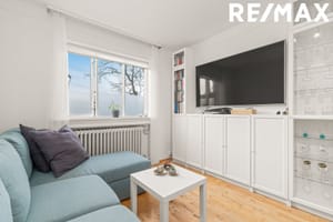 Stofa er björt með gluggum út í garð. Parket á gólfi.