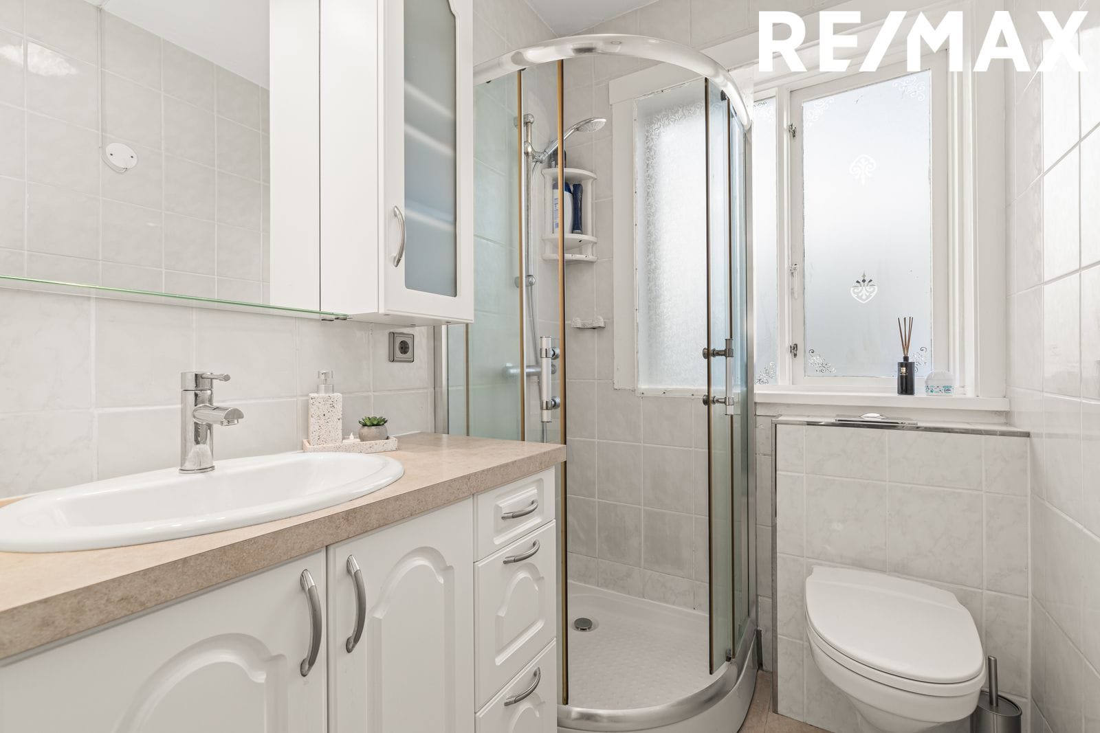 Baðherbergi er flísalagt í hólf og gólf með ljósum flísum. Hvít innrétting undir handlaug og drapplitaðri borðplötu. Speglaskápur með ljósi, veggfestur ílangur hvítur skápur, upphengt salerni, hvítur handklæðaofn og sturtuklefi. Opnanlegt fag í glugga.