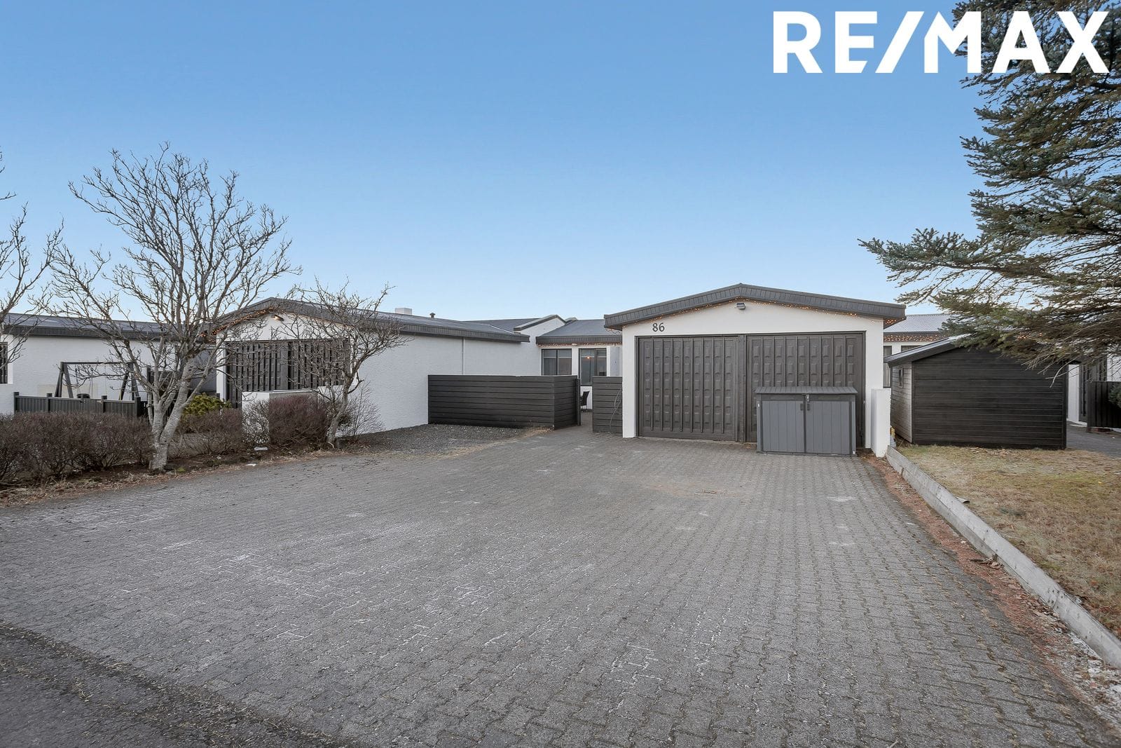 Vel skipulagt 204,4 fm. raðhús við Ásbúð 86, 210 Garðabæ á tveimur hæðum með 41,4 fm. bílskúr og fimm svefnherbergi. Heildarstærð er 245,8 fm.