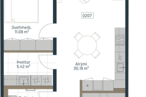 Íbúð 207: Rúmgóð og björt tveggja herbergja, 74,2 m2 íbúð á annari hæð ásamt bílastæði í bílageymslu. Víðsýnt til austurs, gólfsíðir gluggar í stofu. Svalalokun og vandað Bambus pallaefni á svalagólfi. Sér þvottahús innan íbúðar með veglegri innréttingu. Sér 3,7 m2 geymsla í sameign.