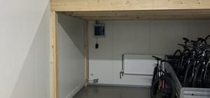 Vaskur með heitu og köldu vatni, ofn til upphitunar innst í skúrnum.