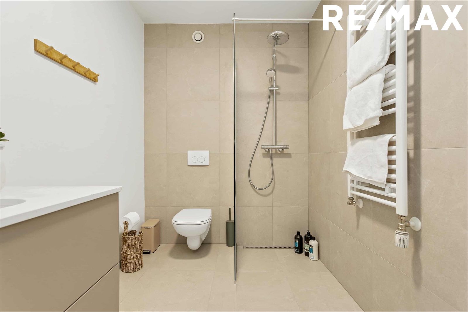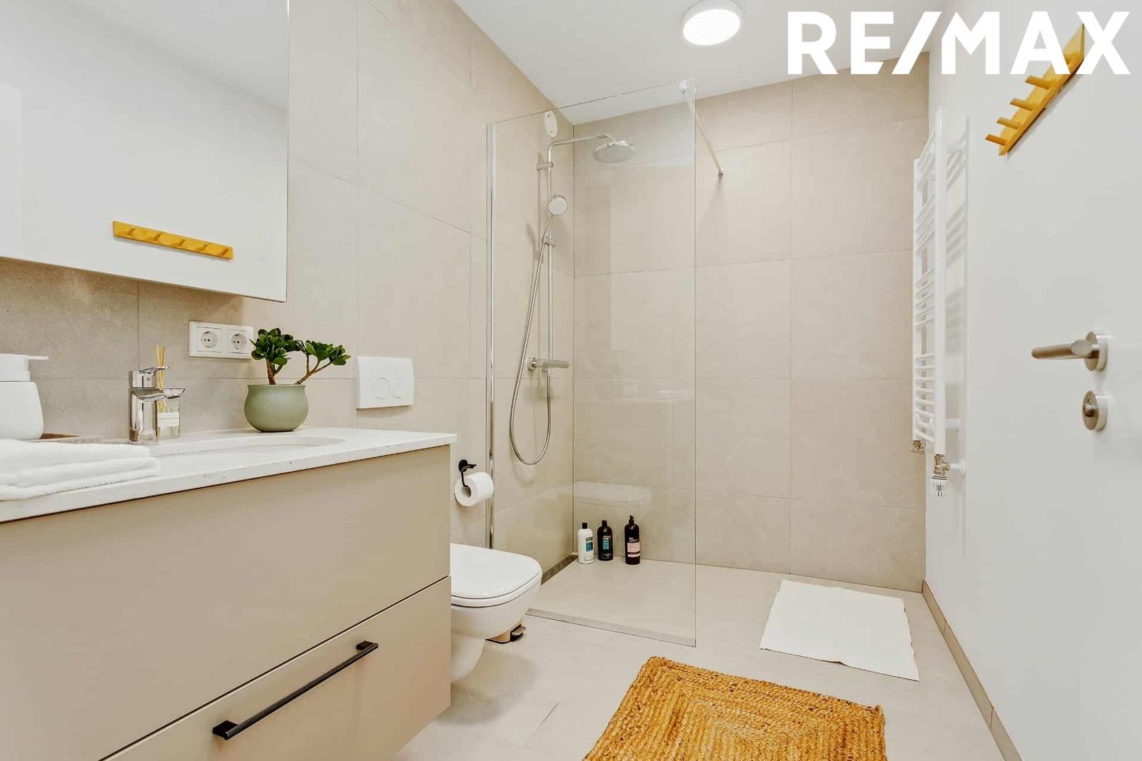 Baðherbergi I: með Walk-in sturtu, flísum á gólfi og á hluta af veggjum. Handklæðaofn, upphengt salerni, baðinnrétting með handlaug og spegil.