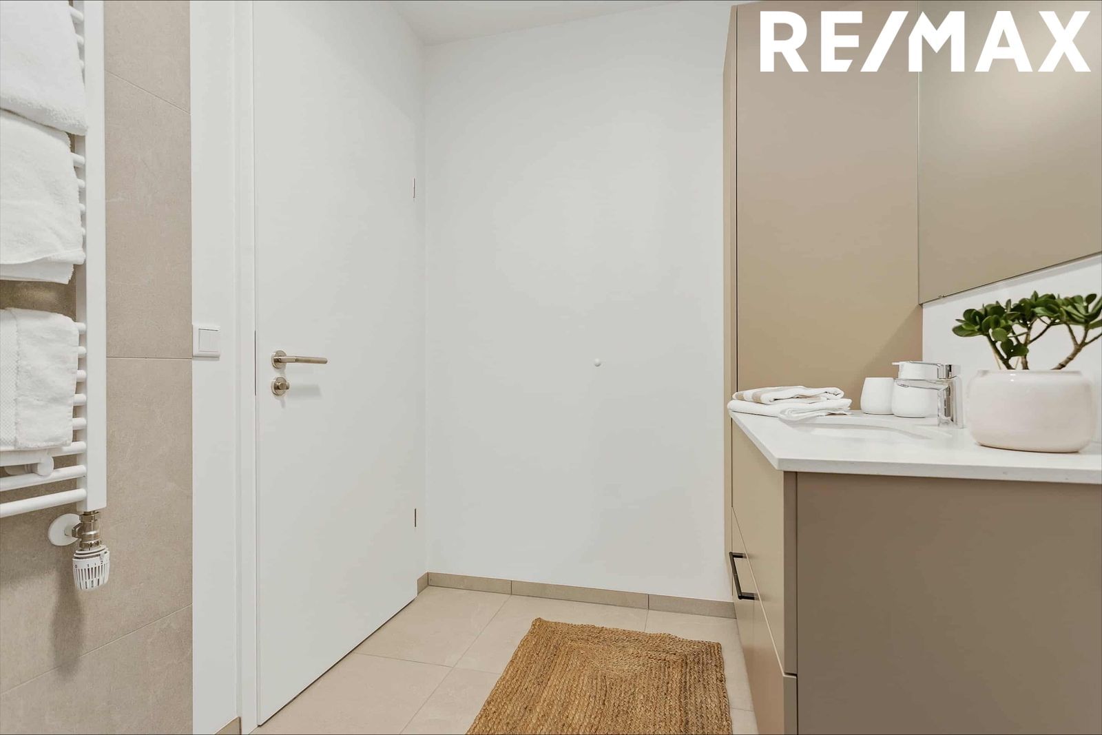 Baðherbergi II: með Walk-in sturtu, flísum á gólfi og á hluta af veggjum. Handklæðaofn, upphengt salerni, baðinnrétting með handlaug og spegil. Tengi fyrir þvottavél og þurrkara.