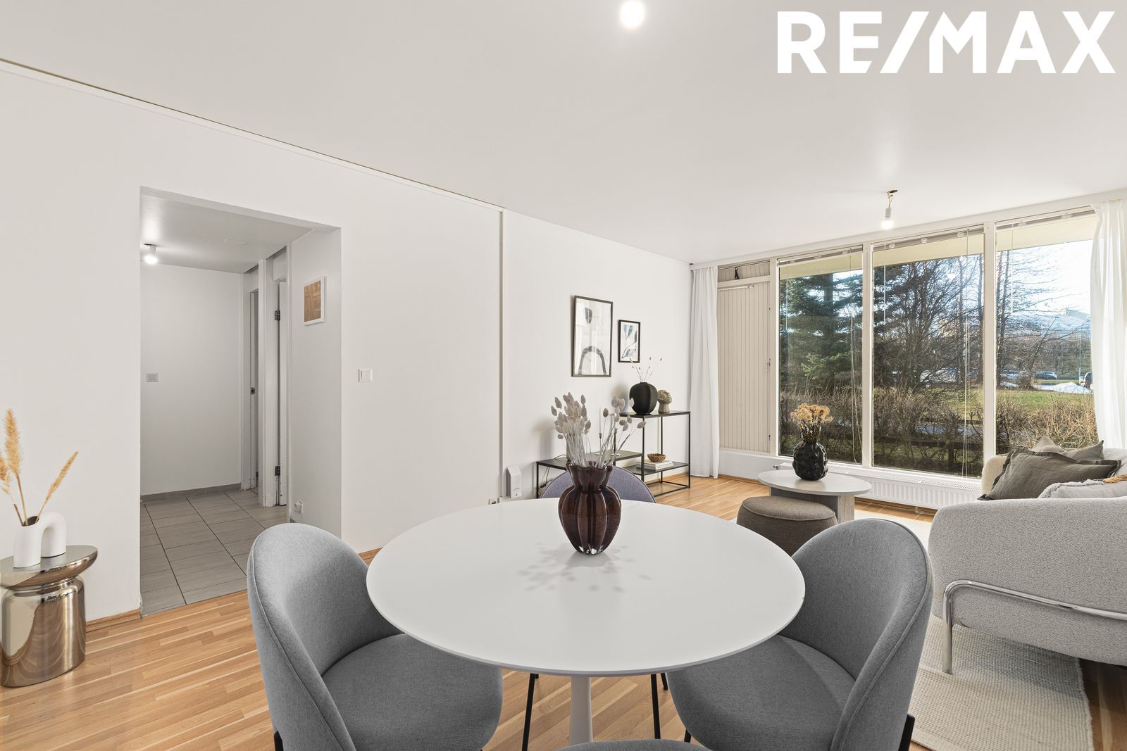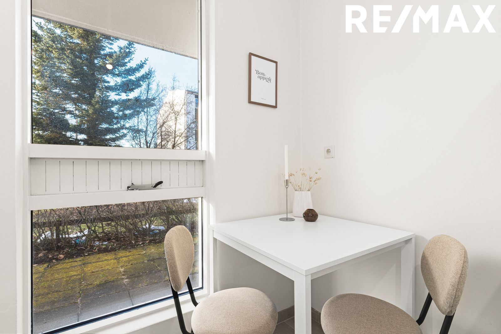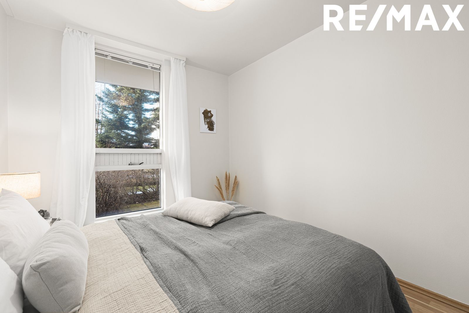 Nánari lýsing: Forstofa: Með harðparketi á gólfi og skápum. Stofa: Er rúmgóð með harðparketi á gólfi. Útgengt út á stóran sérafnotareit sem snýr í vestur, fordæmi eru fyrir góðum sólpalli. Eldhús: Snyrtileg hvít innrétting með flísum á milli skápa, bakaraofn, helluborð, vifta og uppþvottavél. (Fordæmi fyrir því að færa eldhús í stofu og breyta eldhúsi í herbergi) Svefnherbergi I: Rúmgott herbergi með harðparketi á gólfi, skápum og glugga í vestur. Baðherbergi: Með sturtu, Salerni og vask.