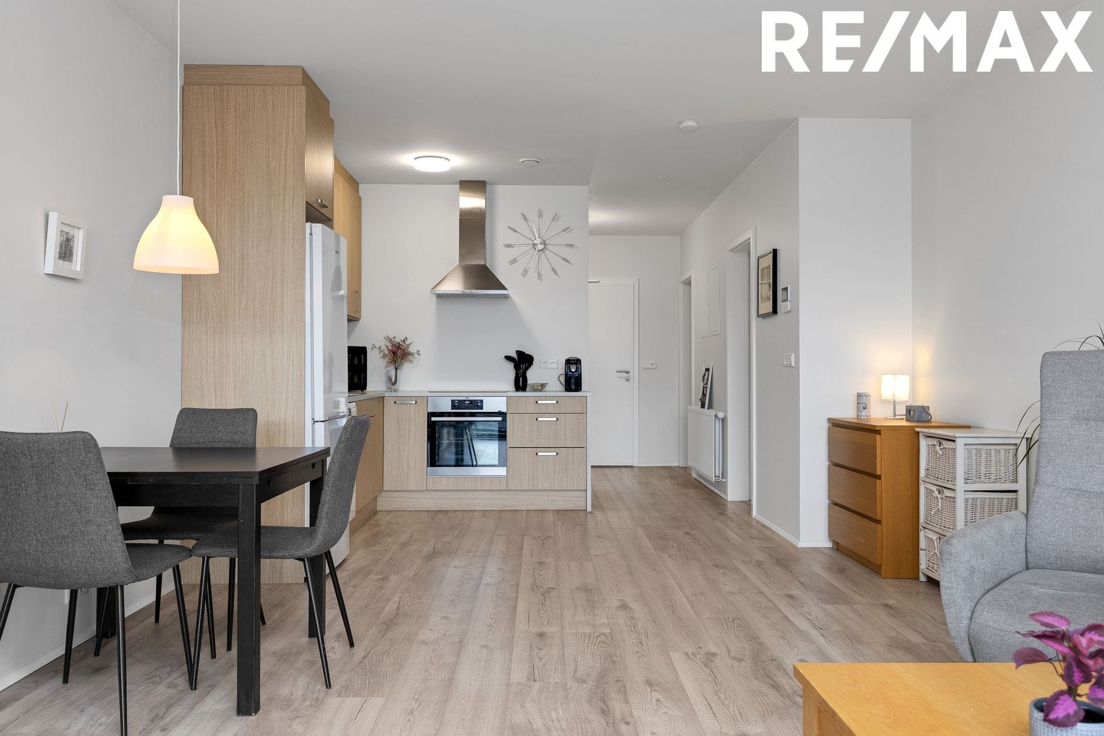 Stofa og eldhús í opnu rými með parket á gólfi. Eldhús með fallegri ljósri innréttingu frá Axis með AEG tækjum og t.f. uppþvottavél.