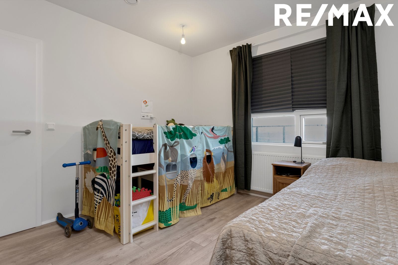 Svefnherbergi er rúmgott með parket á gólfi og góðum fataskápum.
