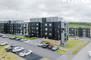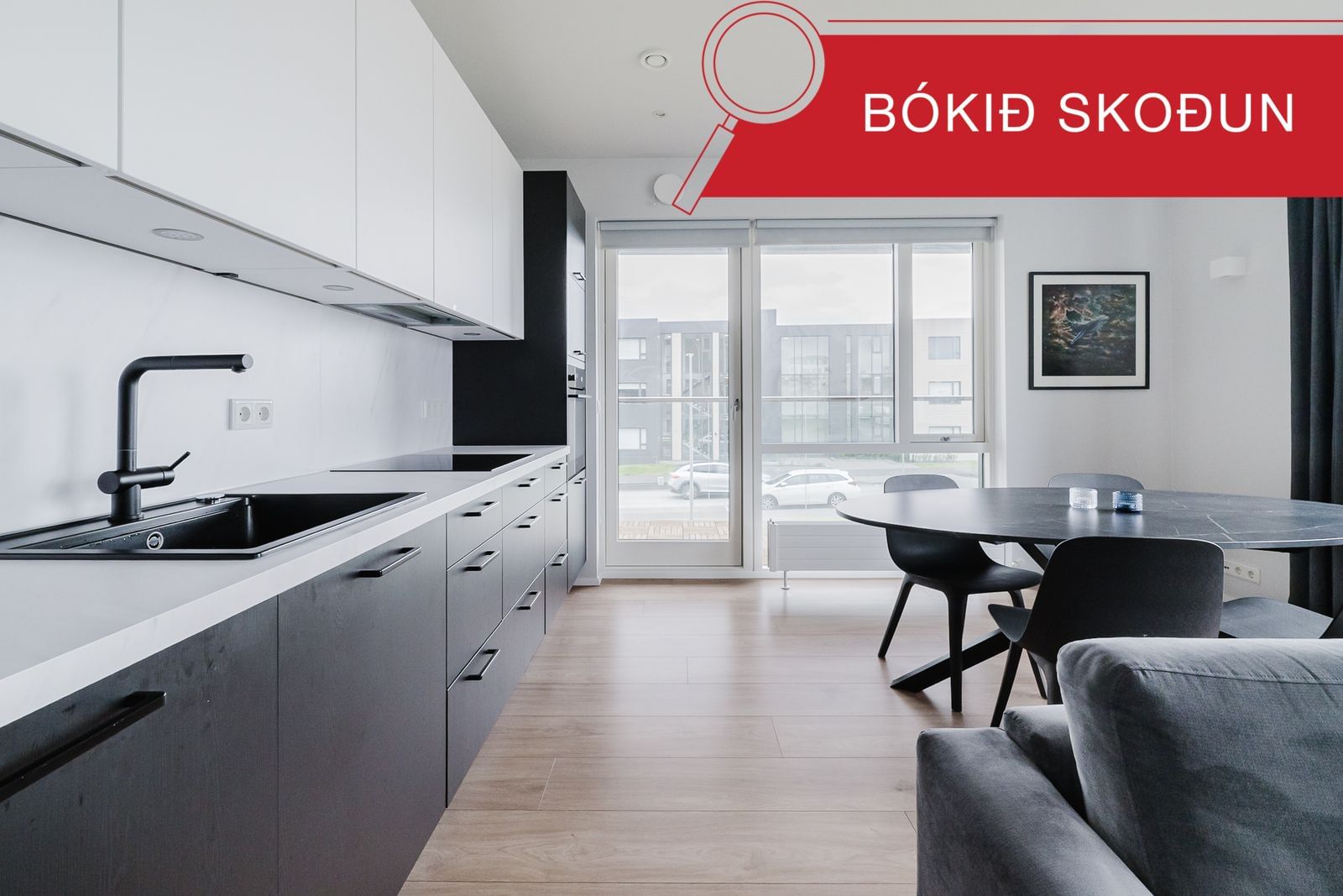 Nánari lýsing: Forstofa: Komið er inn í forstofu með góðu skápaplássi. Harðparketi á gólfi. Stofa/alrými: Útgengt út á svalir. Harðparketi á gólfi. Eldhús: Innrétting frá GKS er svört með hvítum efri skápum. Öll raftæki eru AEG, bakaraofn, ísskápur með frysti, helluborð og uppþvottavél. Svefnherbergi: Rúmgott með góðum fataskáp. Harðparket á gólfi. Baðherbergi: Sturta, hvít innrétting, handlaug, upphengt salerni og handklæðaofn. Aðstaða fyrir þvottavél og þurrkara. Flísar á gólfi. Geymsla: er 4,2 fm og er á fyrstu hæð