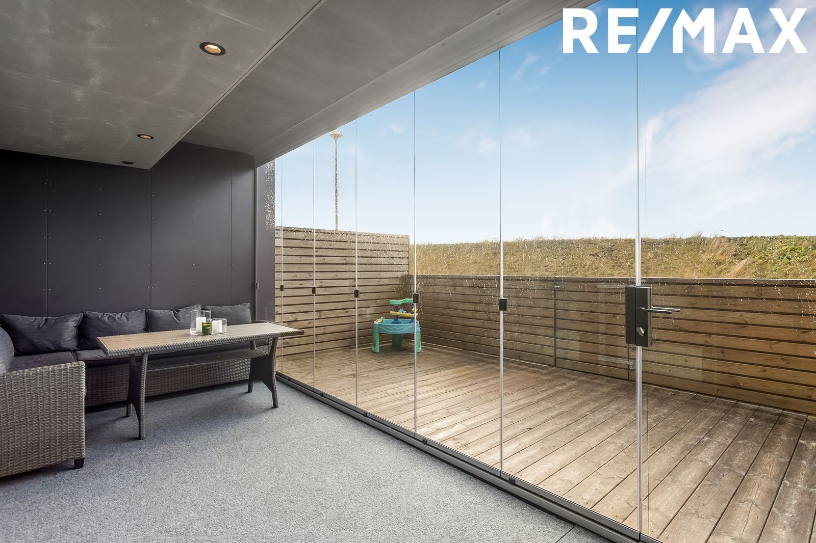 Viðarverönd með skjólgirðingu er um 30 m2 að stærð og er sérafnotareitur íbúðar. Um helmingjur hans er lokaður af með nýrri svalarlokun. Rafmagnstengi er til staðar til að bæta við hitara. Sólar nýtur við undir hádegi og fram á kvöld. Aftan við hús er grassvæði og göngustígar.
