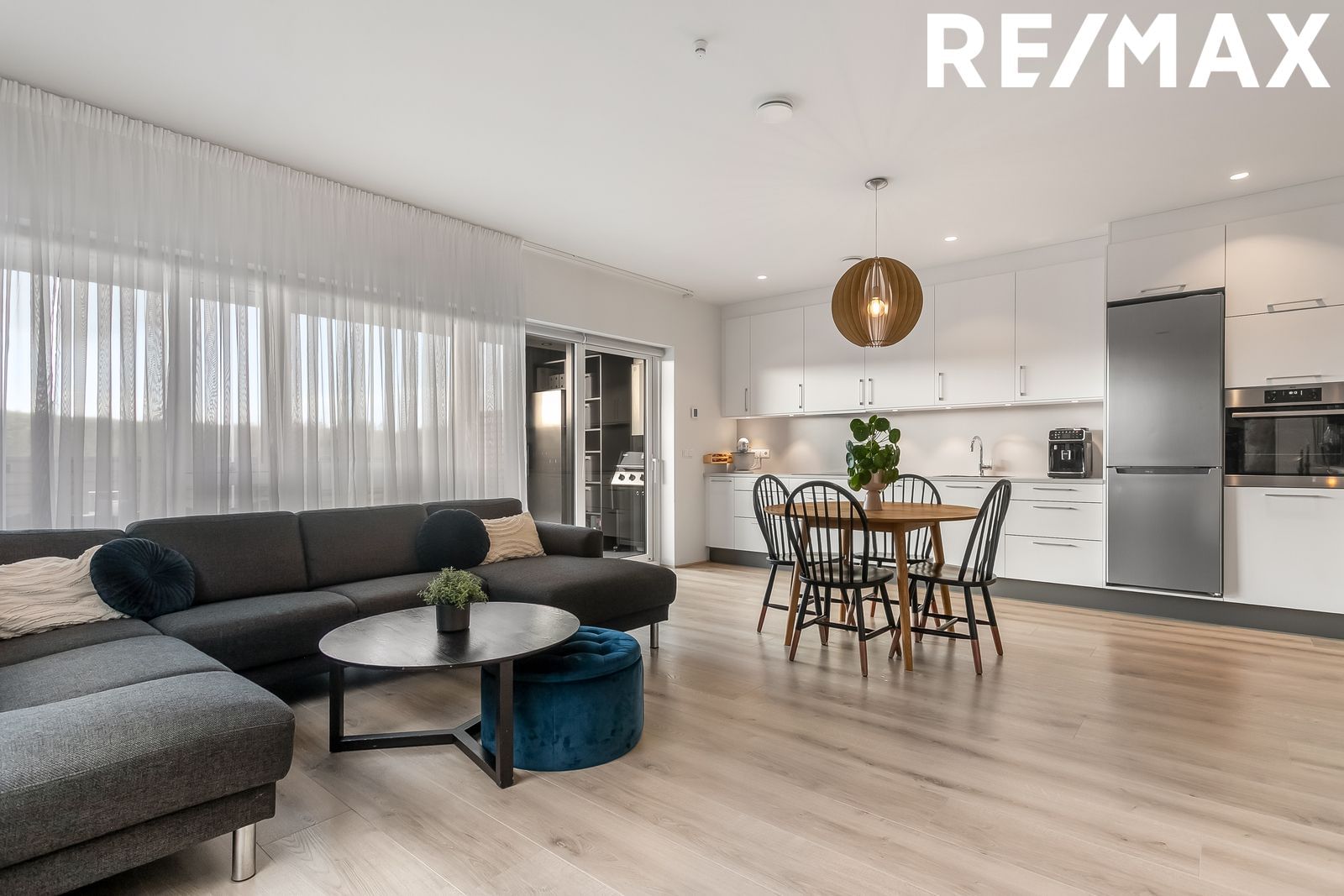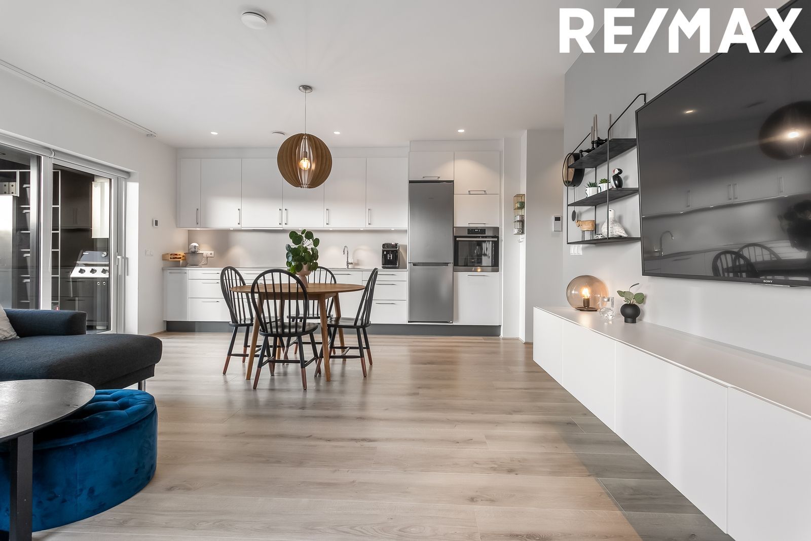 Stofa er björt með gluggum á tvo vegu. Innbyggð lýsing í lofti stofurýmis og gangs. Út frá stofu og eldhúsi er gengið út á stóra viðarverönd með skjólgirðingu. Gengið er um rennihurð og stækkar því pallurinn verulega stofurýmið. Parket á gólfi stofu.