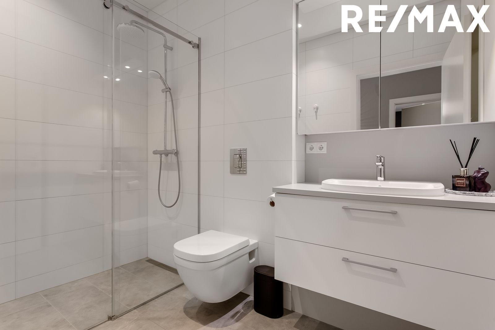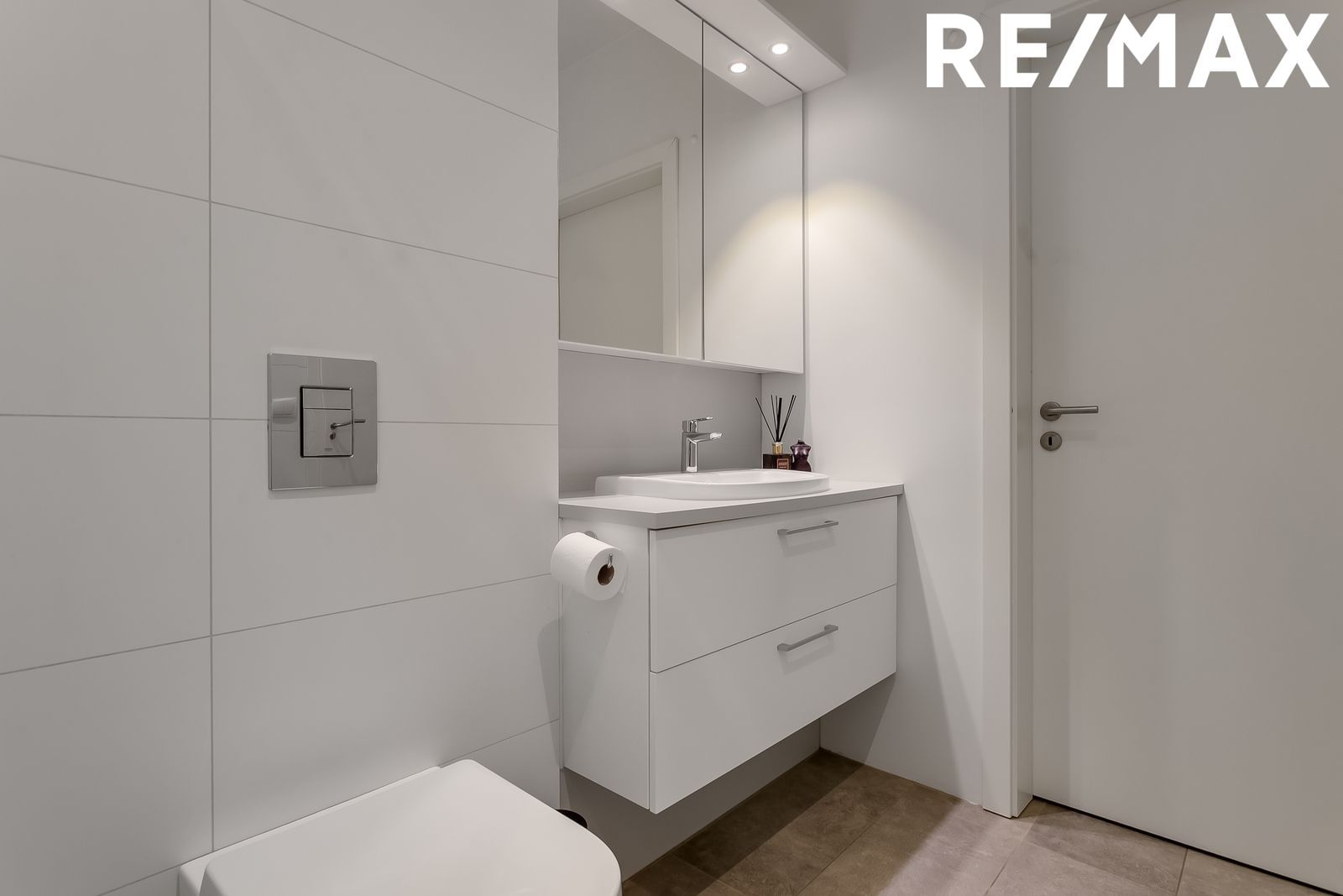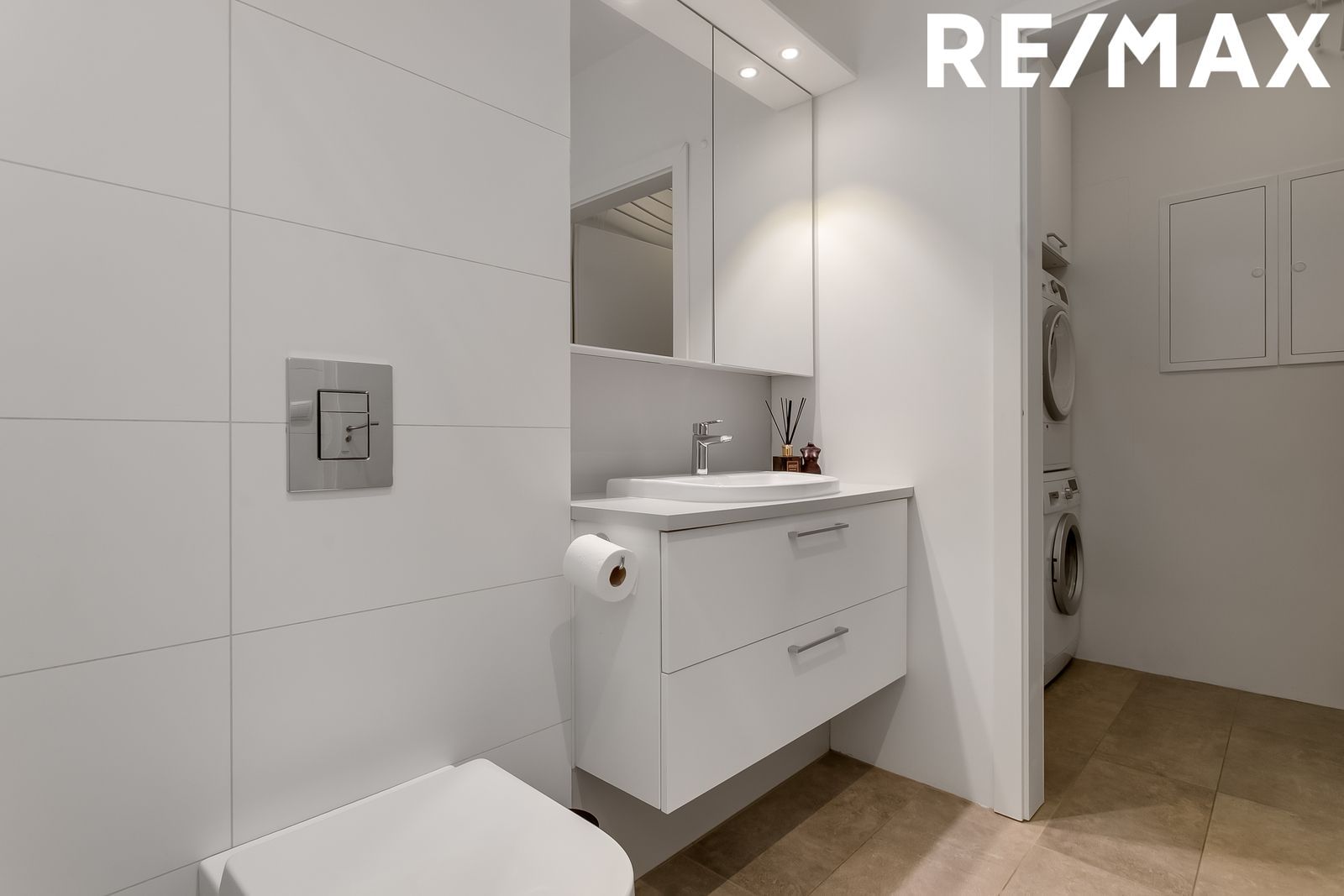 Baðherbergi er með skápaeiningu undir handlaug og veggfestum speglaskáp með ljósi. Þreplaus sturta með gleri, handklæðaofn og upphengt salerni. Ljósgráar gólfflísar og hvítar upp veggi. Inn af baðherbergi er þvottahús.