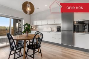 Eldhús er með hvítri innréttingu á einum vegg. Blástursofn, helluborð og gufugleypir eru AEG. Innfelld uppþvottavél. Stæði er fyrir ísskáp í innréttingu. Mjög gott skápapláss. Blöndunartæki eru Grohe. Parket á gólfi.