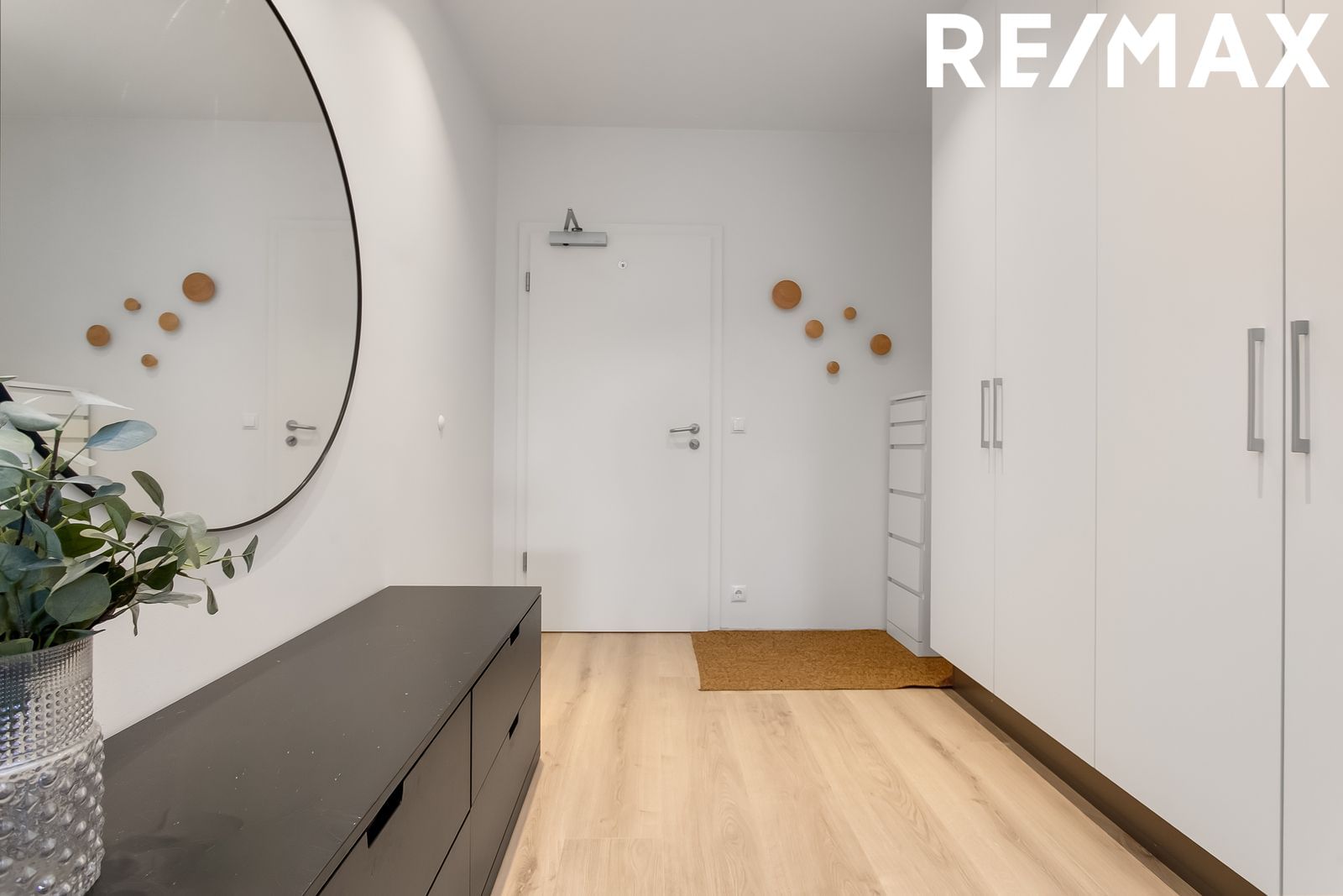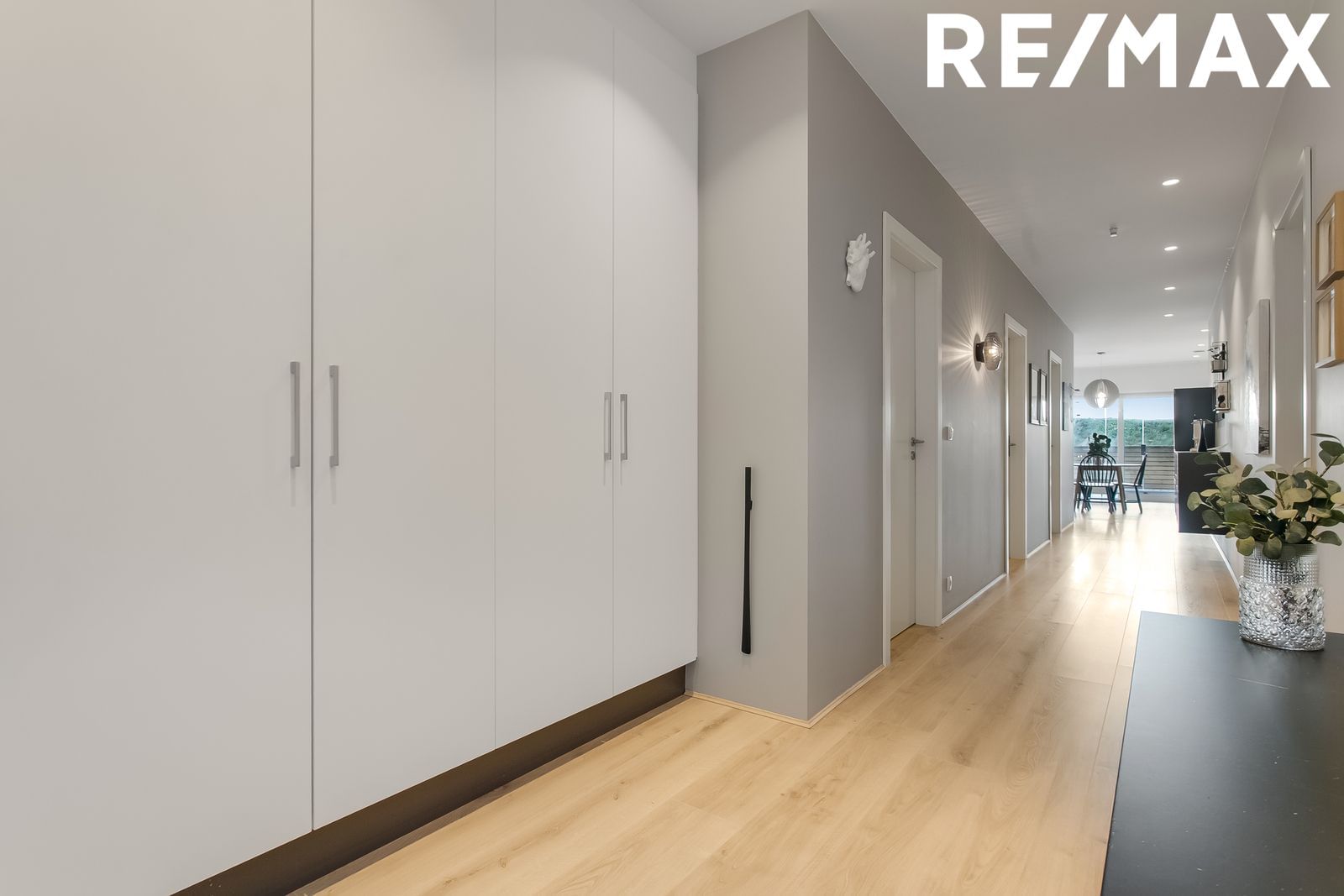 lyftu. Innan íbúðar er komið inn á parketlagt forstofuhol með fjórföldum hvítum fataskáp sem nær upp í loft.