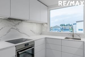 Lýsing eignar: Efri hæð. Forstofa: Með flísum á gólfi. Gestasalerni: Flísar á gólfi og hluta af veggjum og innréttingu. Stofa: Er opin og björt, parket á gólfi og með útgengi út á stórar svalir og garð sem eru í suður með glæsilegu útsýni. Eldhús: Ný innrétting, mjög rúmgóð og falleg með miklu borðplássi. Steinn á borði og með nýjum tækjum og með marmarflísum á milli skápa. Baðherbergi: Flísalagt í hólf og gólf. Walk in sturta, með fallegri innréttingu og upphengdu salerni. Svefnherbergin: Eru 4 og eru þau öll rúmgóð og með parket á gólfi.