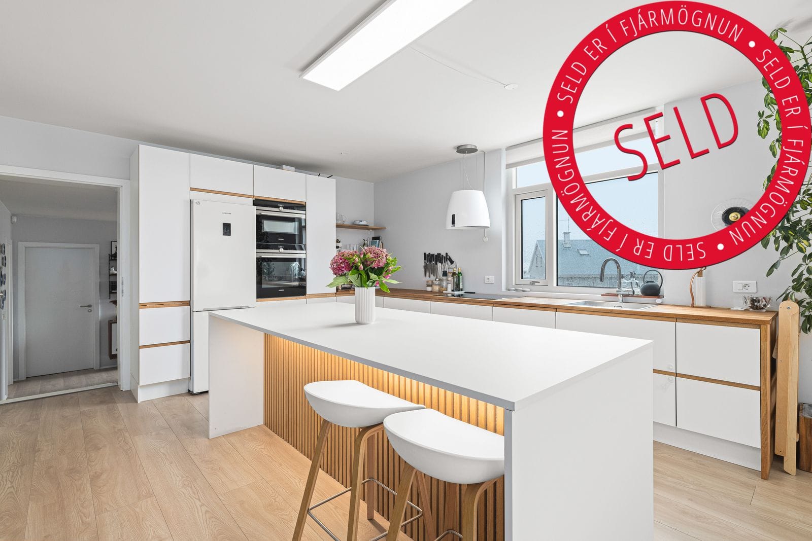 NÁNARI LÝSING: Komið inn í anddyri með nýlegum fataskápum. Salerni innaf anddyri með upphengdu wc, handklæðaofn og tengi fyrir þvottavél og þurrkara. Þaðan er gengið inn í rúmgott nýlegt eldhús með fallegri og vandaðri innréttingu, gott vinnu- og skápapláss, eyja sem hægt er að sitja við með skápum, vönduð tæki, gluggi í vestur. Eldhúsið er opið í miðju íbúðar og er hjartað í henni. Stofan og borðstofan eru samliggjandi, mjög rúmgóðar með útgengi á sólríkar vestur svalir. Gengið er niður tvö þrep í svefnálmu. Gott sjónvarpshol. Tvö barnaherbergi. Hjónaherbergi með góðu skápaplássi með útgengi á svalir sem snúa í suð-austur. Baðherbergið er endurnýjað, rúmgott með fallegri innréttingu, speglaskápur með innfelldri lýsingu, sér rúmgóð sturta og gott baðkar. Þvottahús er á hæðinni sem einungis 3 íbúðir hafa aðgang að.