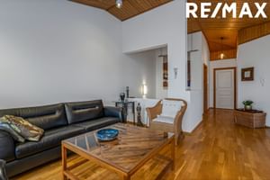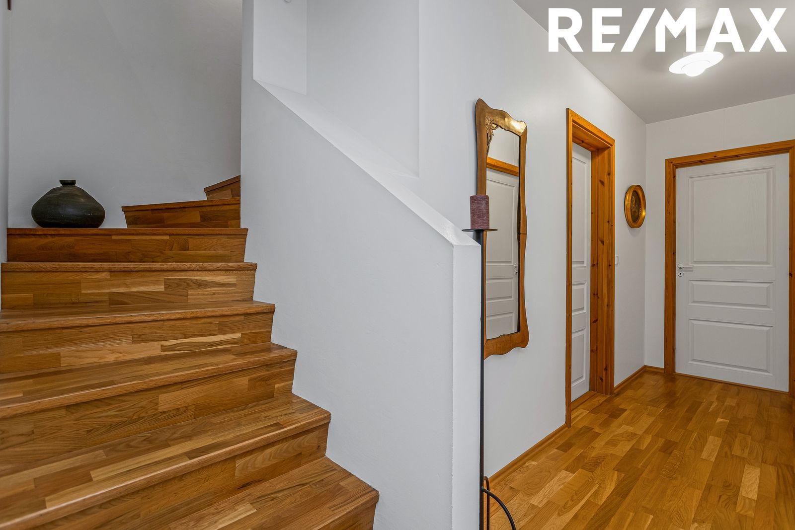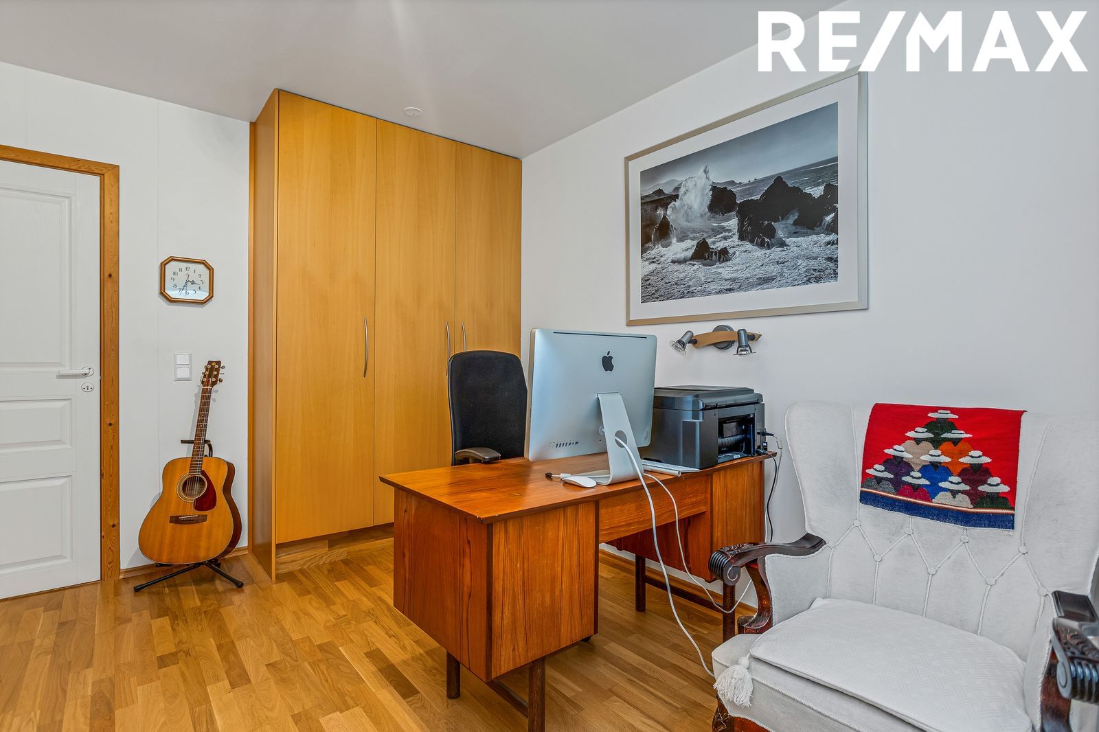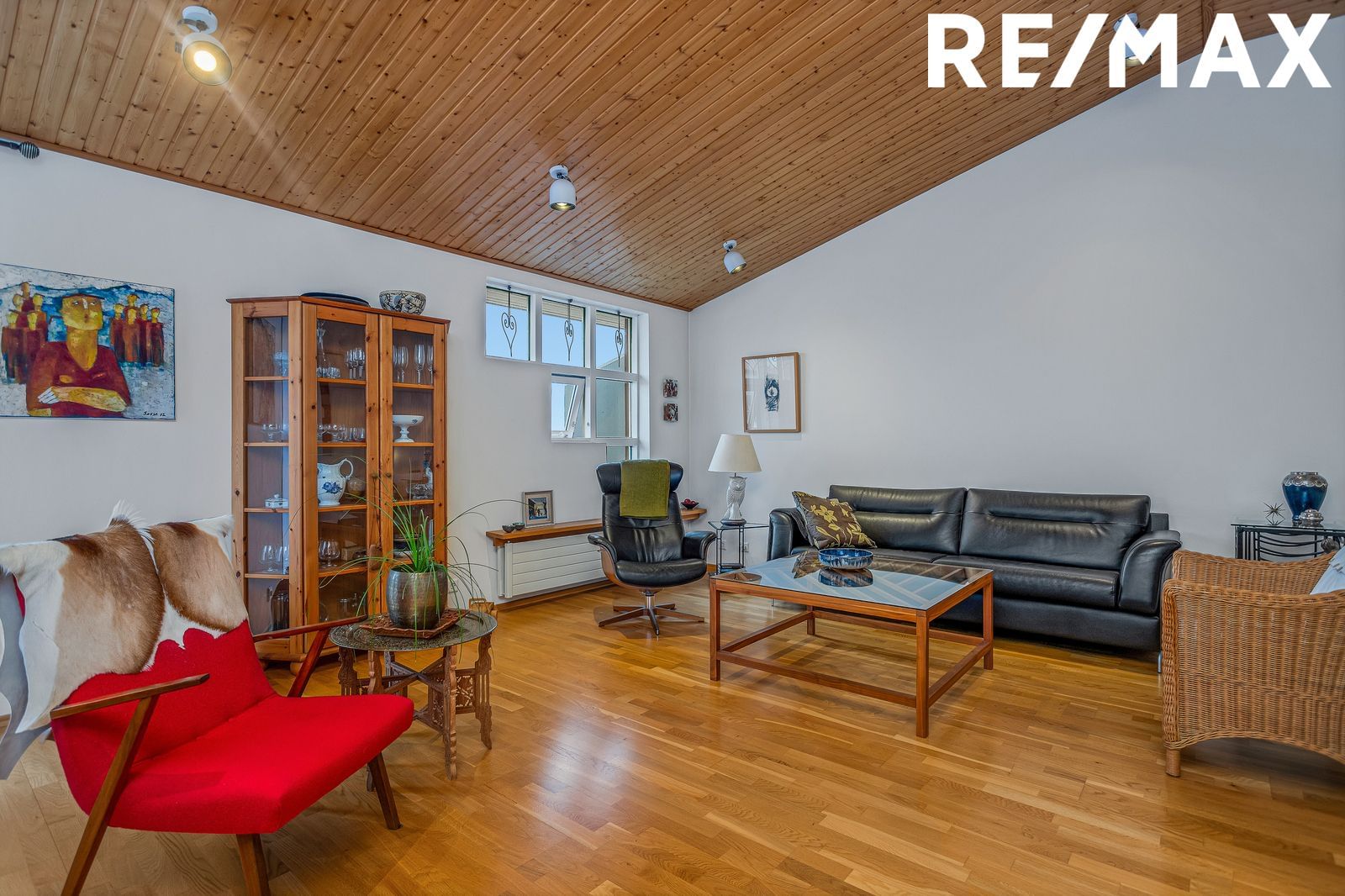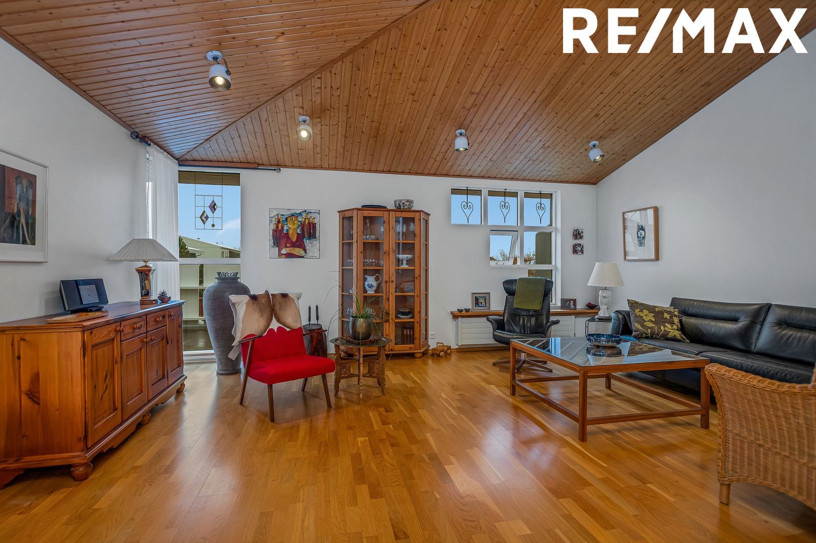 2. hæð Stigi upp er parketlagður, pússaður og lakkaður árið 2021. Stofan er stór og með hárri lofthæð. Parket á gólfi. Borðstofa er á milli eldhúss og stofu, flísar á gólfi og gólfsíðir gluggar. Útgengt frá borðstofu út á 28 m² svalir. Svalagólf var endurgert 2020. Eldhús er inn af borðstofu. Innréttting með miklu skápaplássi, bökunarofn í vinnuhæð, flísar á milli skápa. Borðkrókur við henda eldhúss. Flísar á gólfi. Baðherbergi 2 er flísalagt í hólf og gólf. Klósett, vaskur, handklæðaofn og baðkar. Herbergi 4 er parketlagt með gluggum á tveim hliðum. Stór fataskápur.
