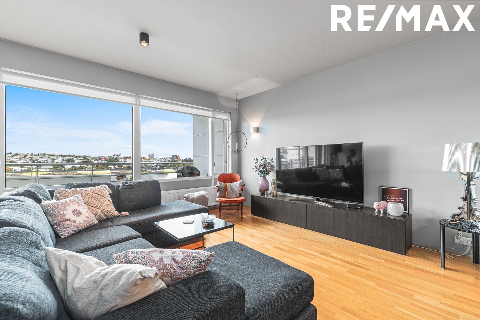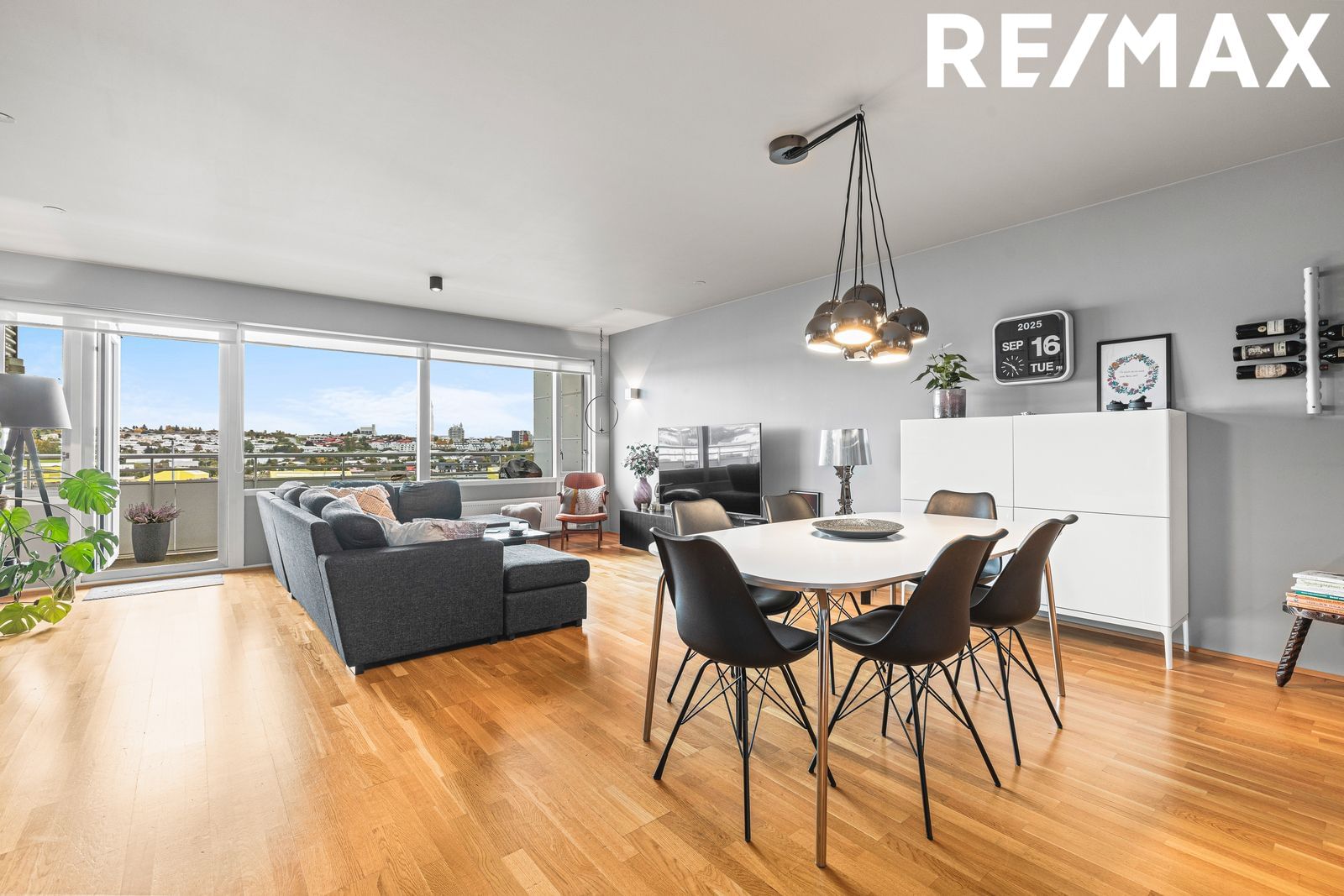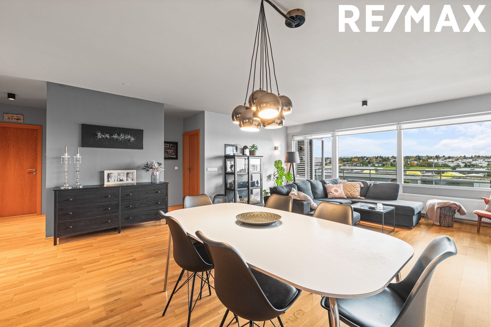 Alrými: Stofa/borðastofa er rúmgóð og björt með parketi á gólfi. Góðir gluggar til suðurs með fallegu útsýni. Gengið er úr stofu og út á rúmgóðar 10 fm2 svalir.