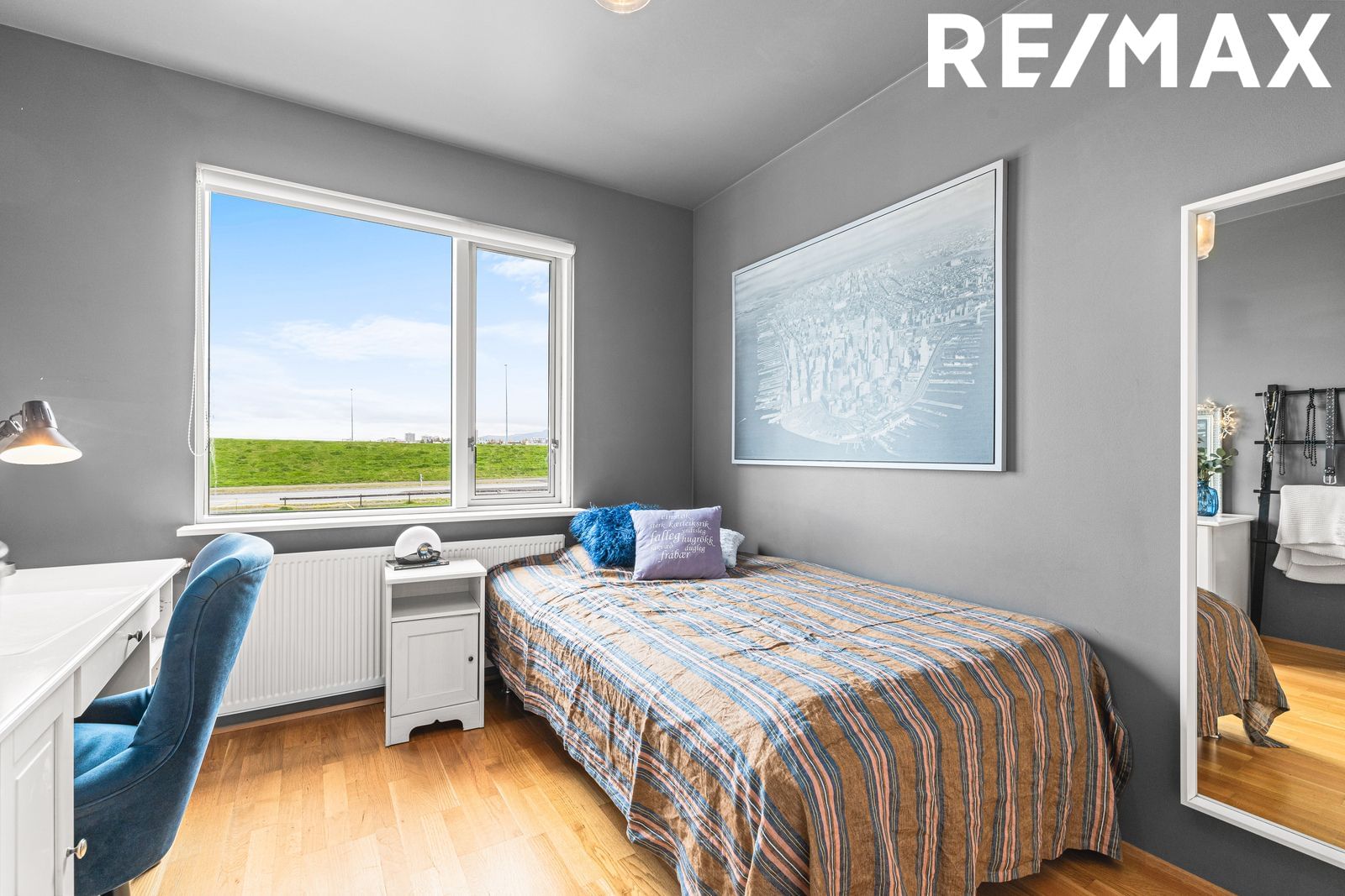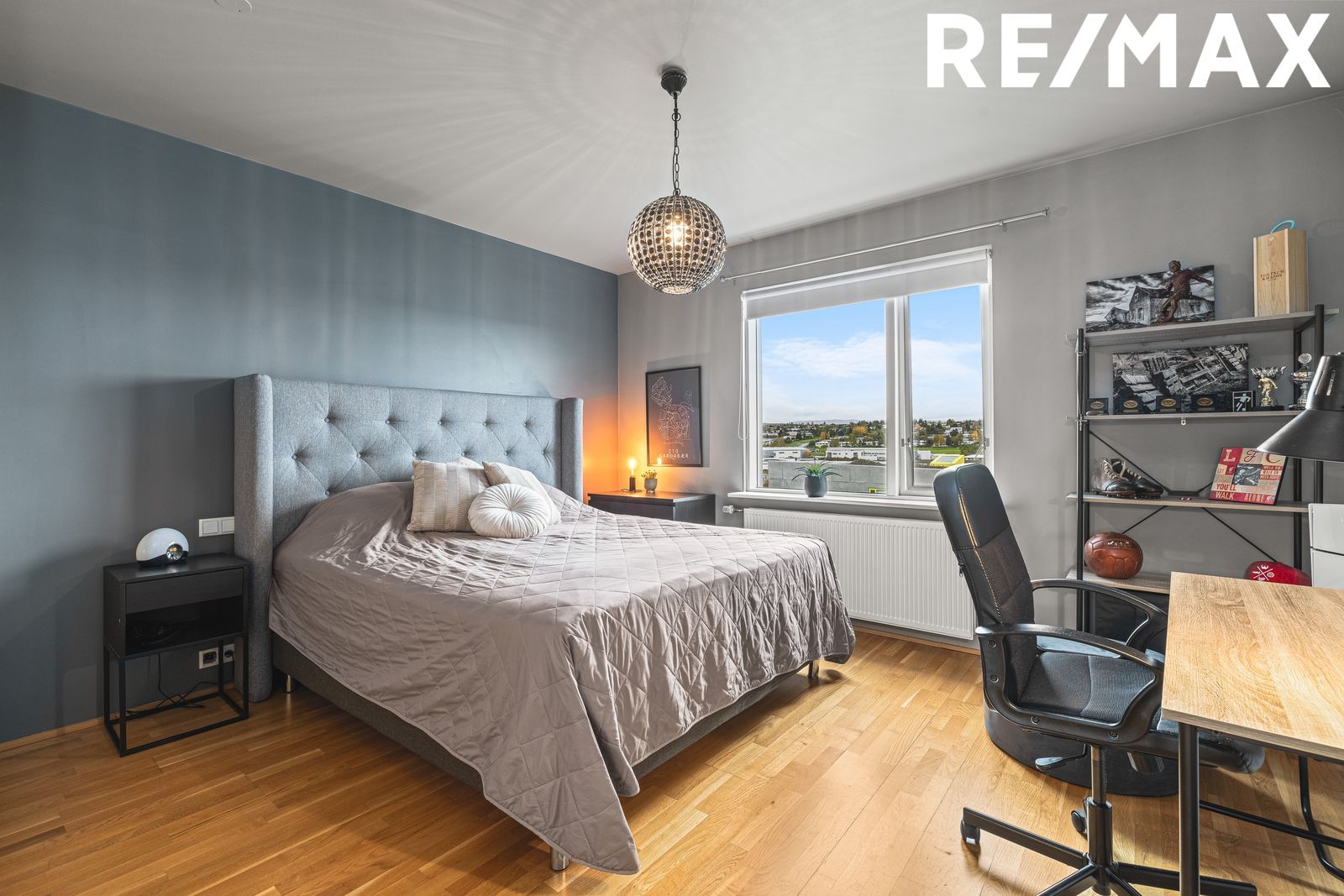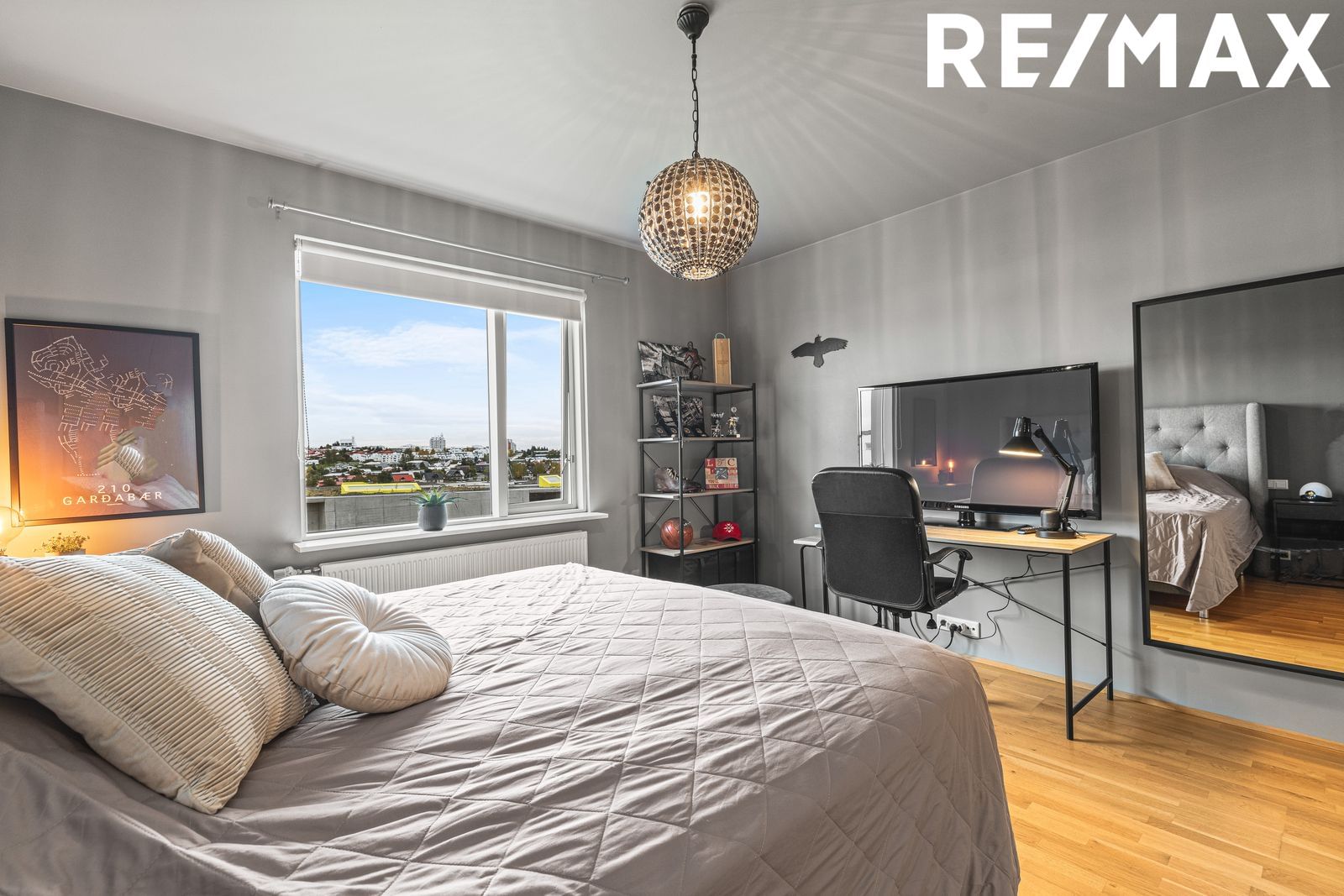 Hjónaherbergi: Er rúmgott og bjart með parketi á gólfi og góðum skápum sem ná upp í loft.