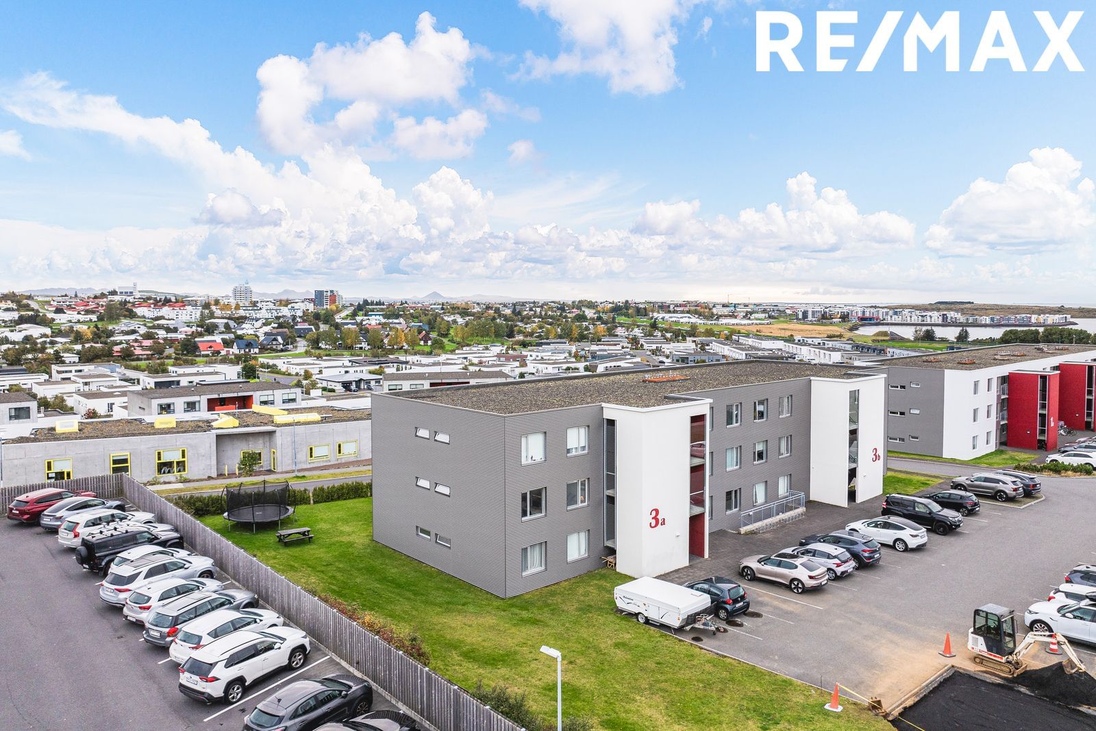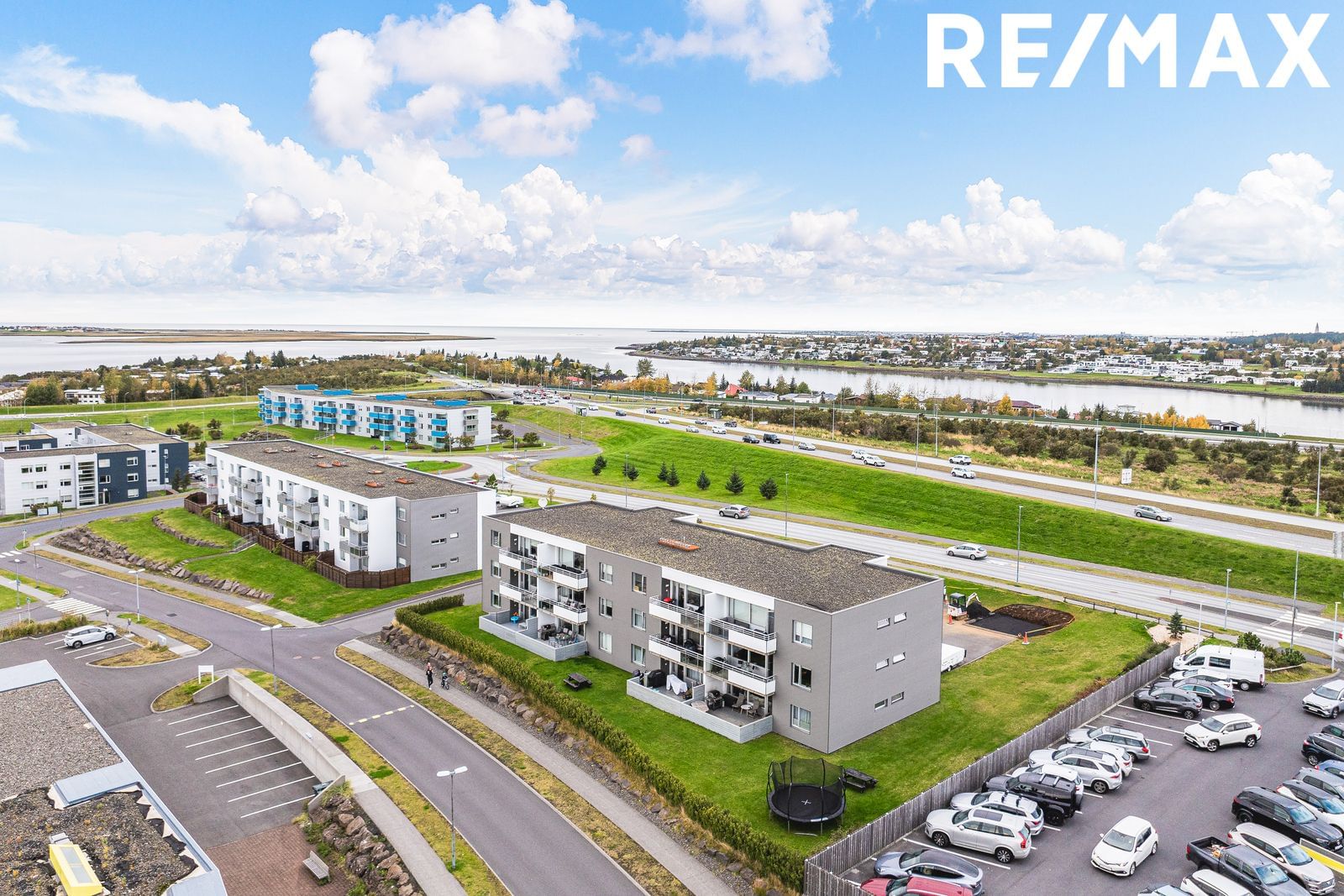Lóðin er fullfrágengin með góðri aðkomu, snyrtilegri sameiginlegri lóð og bílastæðum þar sem búið að setja upp hleðslustöðvar.