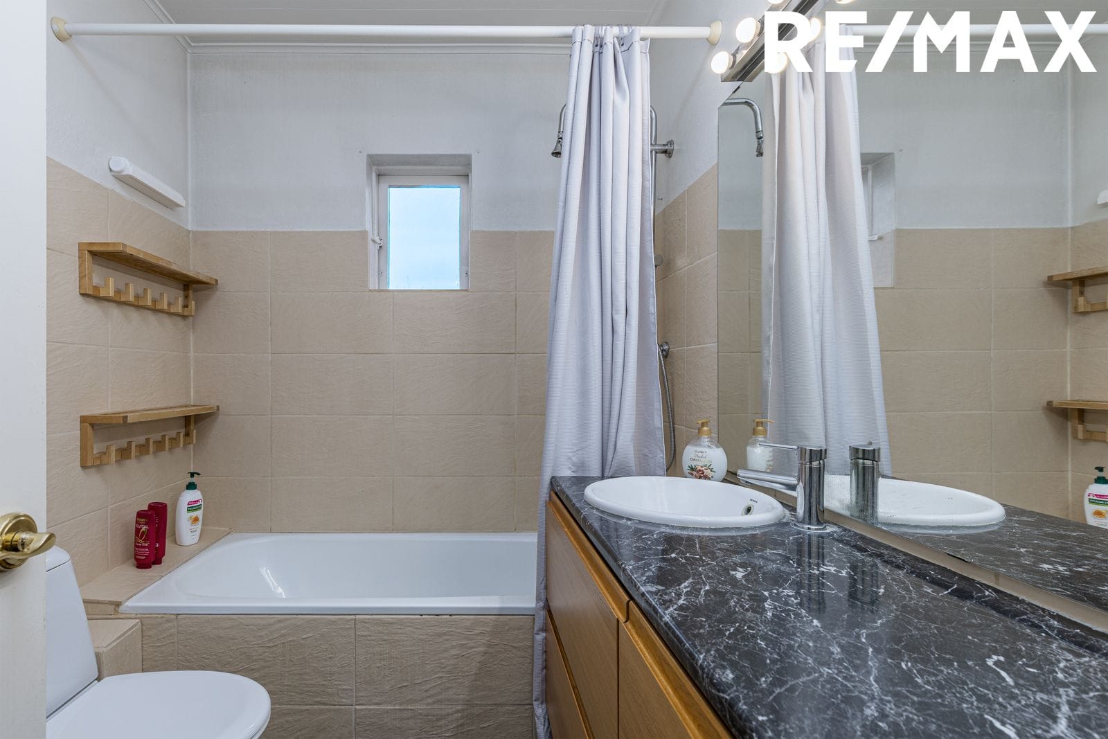Baðherbergi: Flísar á gólfi og á veggjum í kringum baðkarið. Innrétting með handlaug. Gluggi er í rýminu.