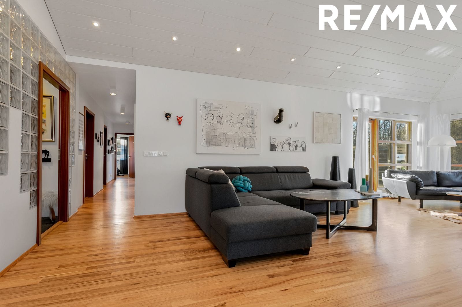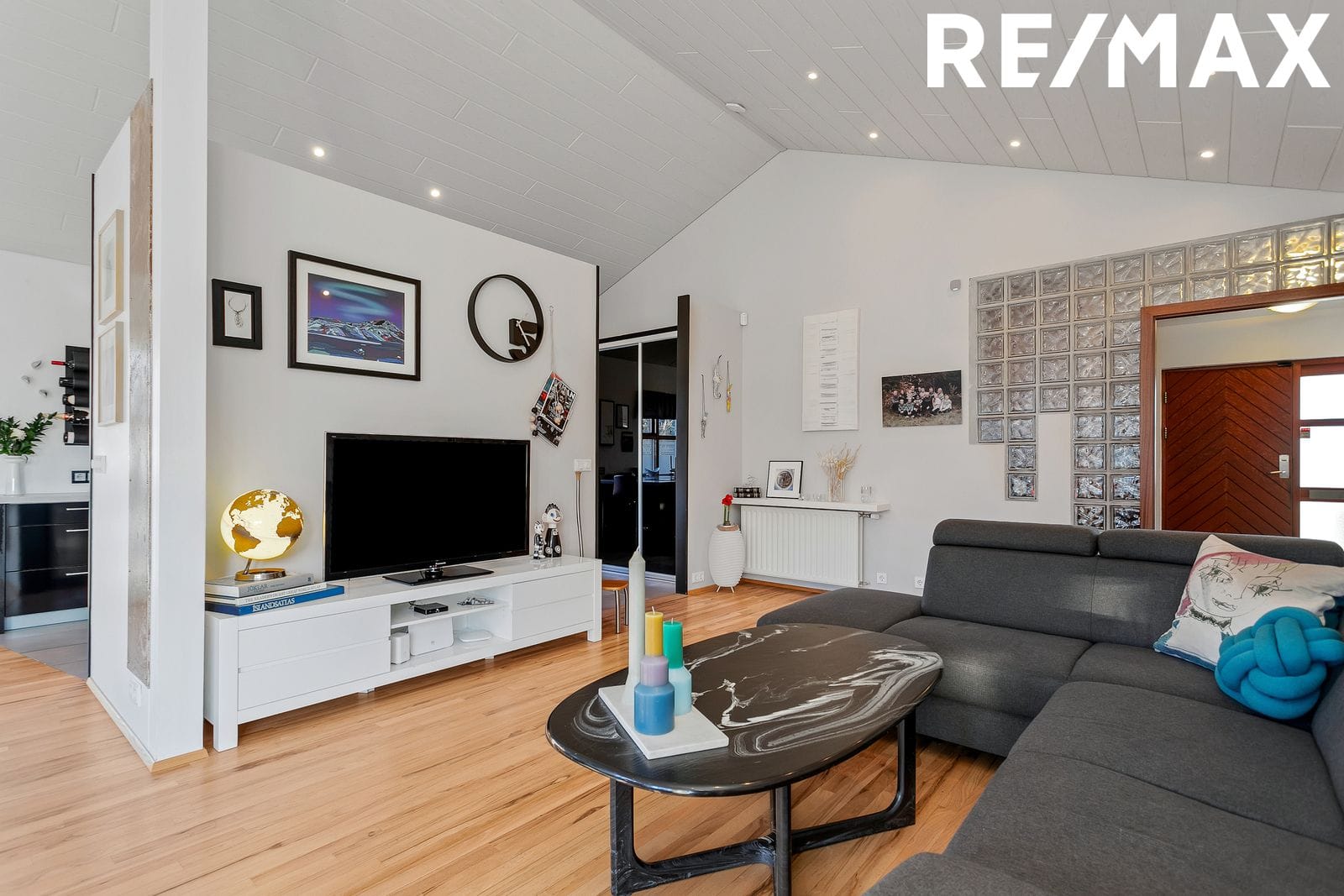 Sjónvarpsstofa með eikarparketi á gólfi..