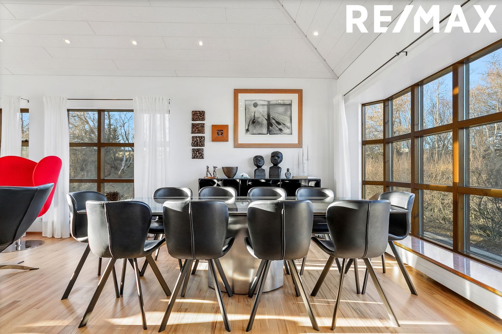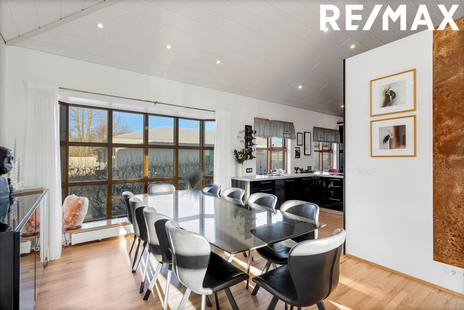Borðstofa er björt inn af eldhúsi. eikarparketi á gólfi.
