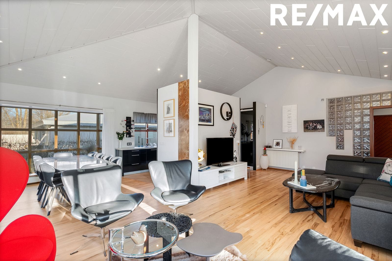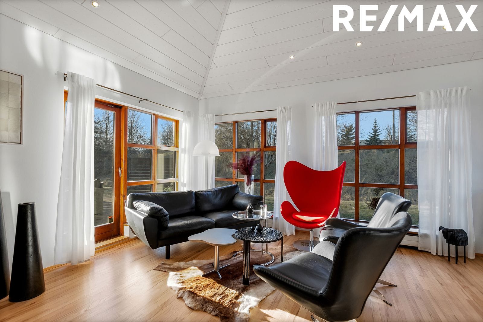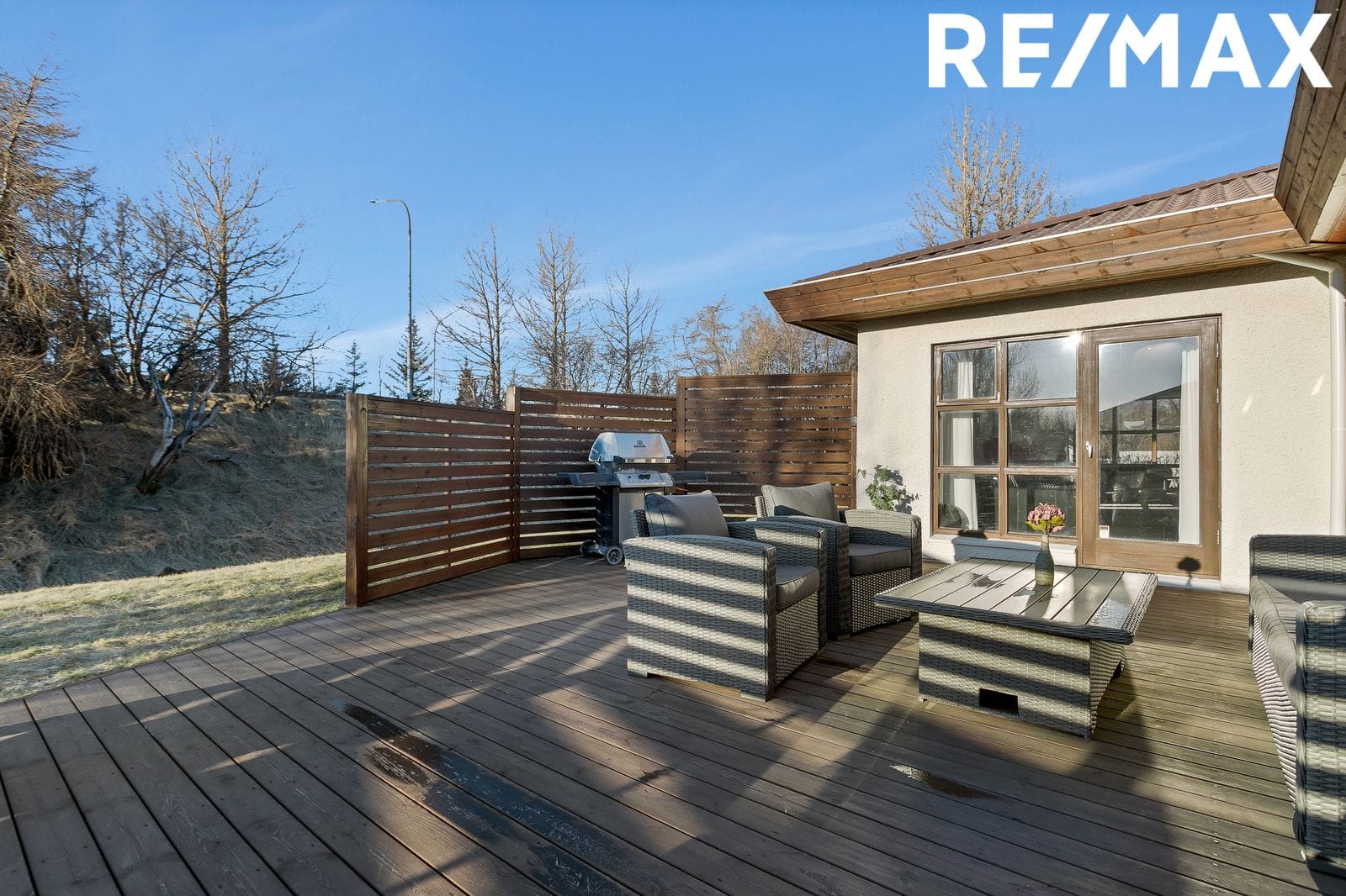 Stofan er opin og björt með gegnheilu eikarparketi á gólfi. Útgengi á viðarverönd með heitum potti og skjólveggjum.