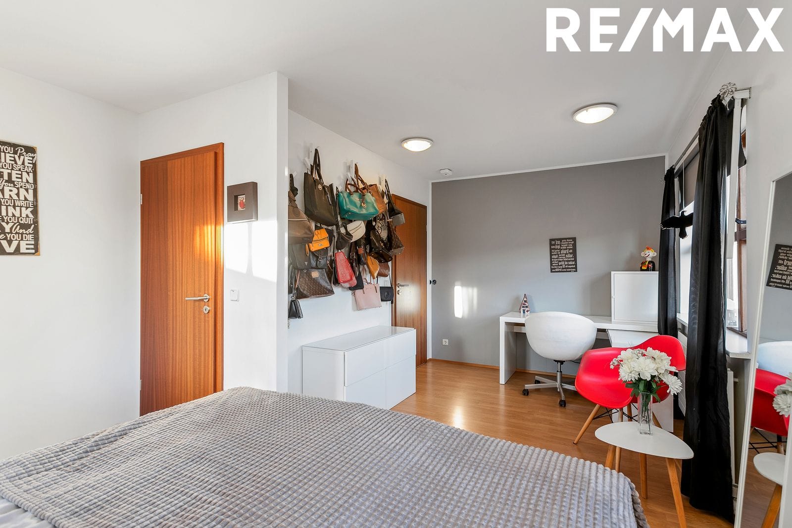 Hjónaherbergi með parketi á gólfi og fataskáp