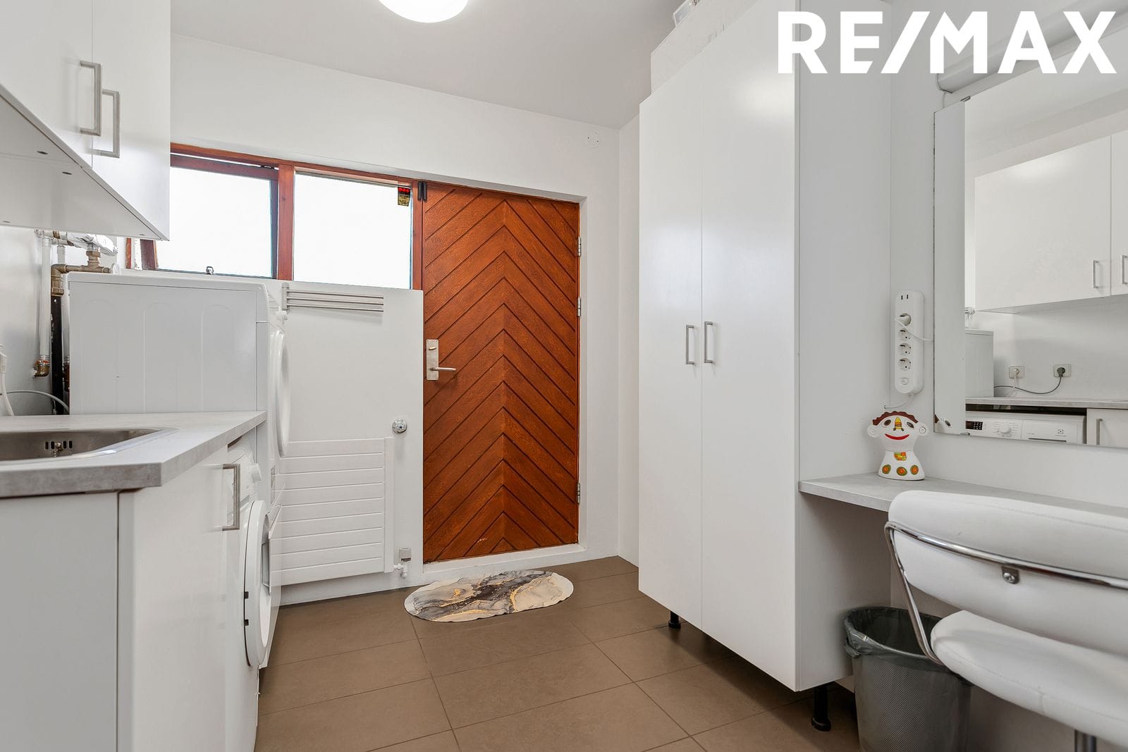 Þvottahús með innréttingu fyrir vélar og góðu skápaplássi. Flísar á gólfi.