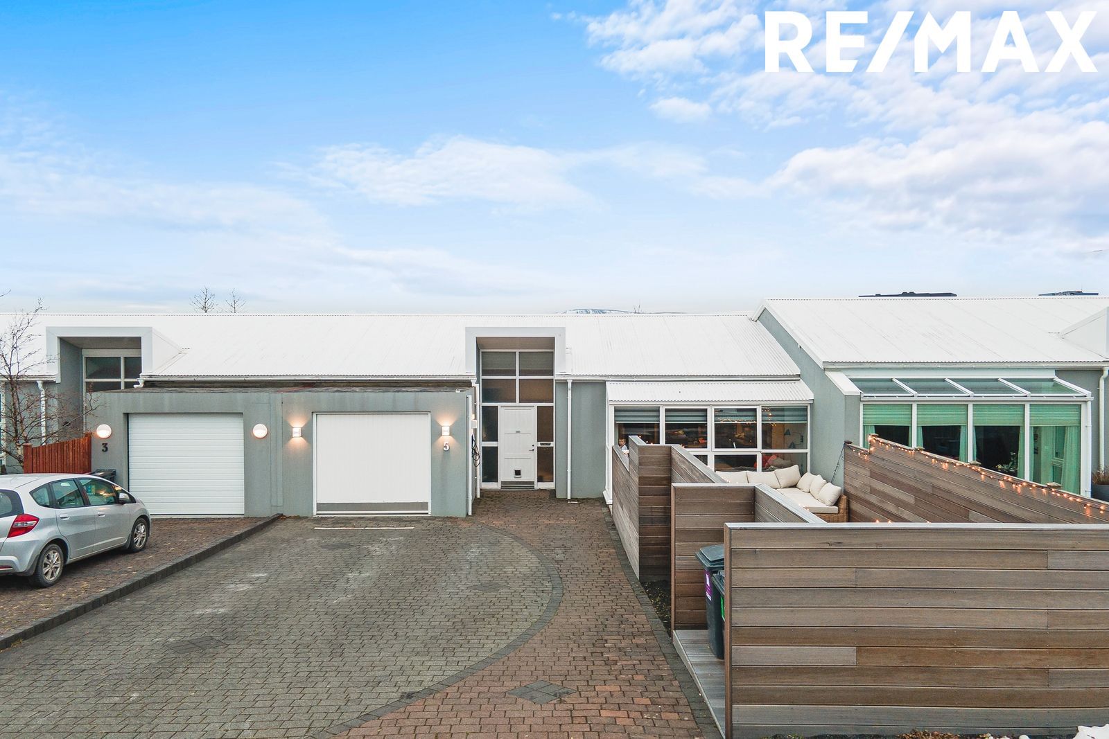 Fallegur garður að aftanverðu með barnakofa, og kaldri i útigeymslu, stór nýleg verönd til suð-vesturs með heitum potti með stýringu í appi. Leiksvæði/tæki fyrir börnin fyrir neðan garðinn. Bílaplanið er hellulagt með snjóbræðslu.