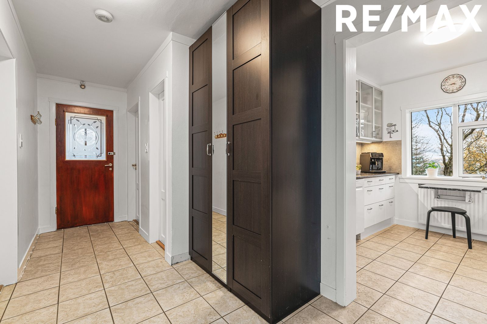 Forstofa er inn af sameiginlegum inngangi með íbúð í risi. Innan íbúðar er komið inn á flísalagt forstofuhol. Svartur fataskápur með spegli er inni á holi.
