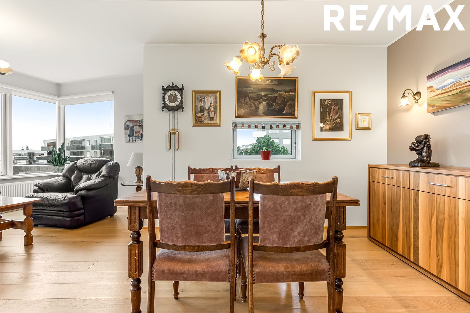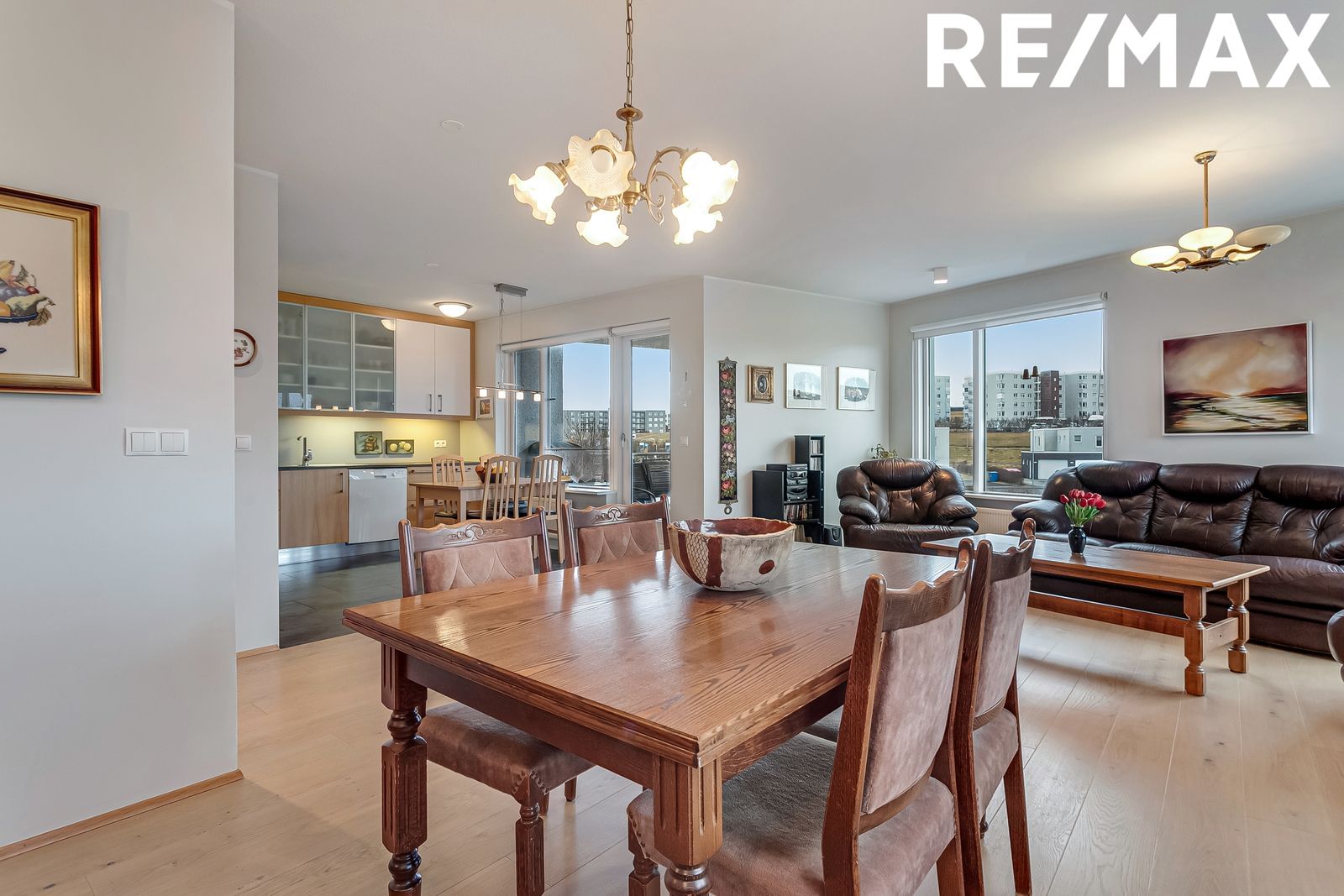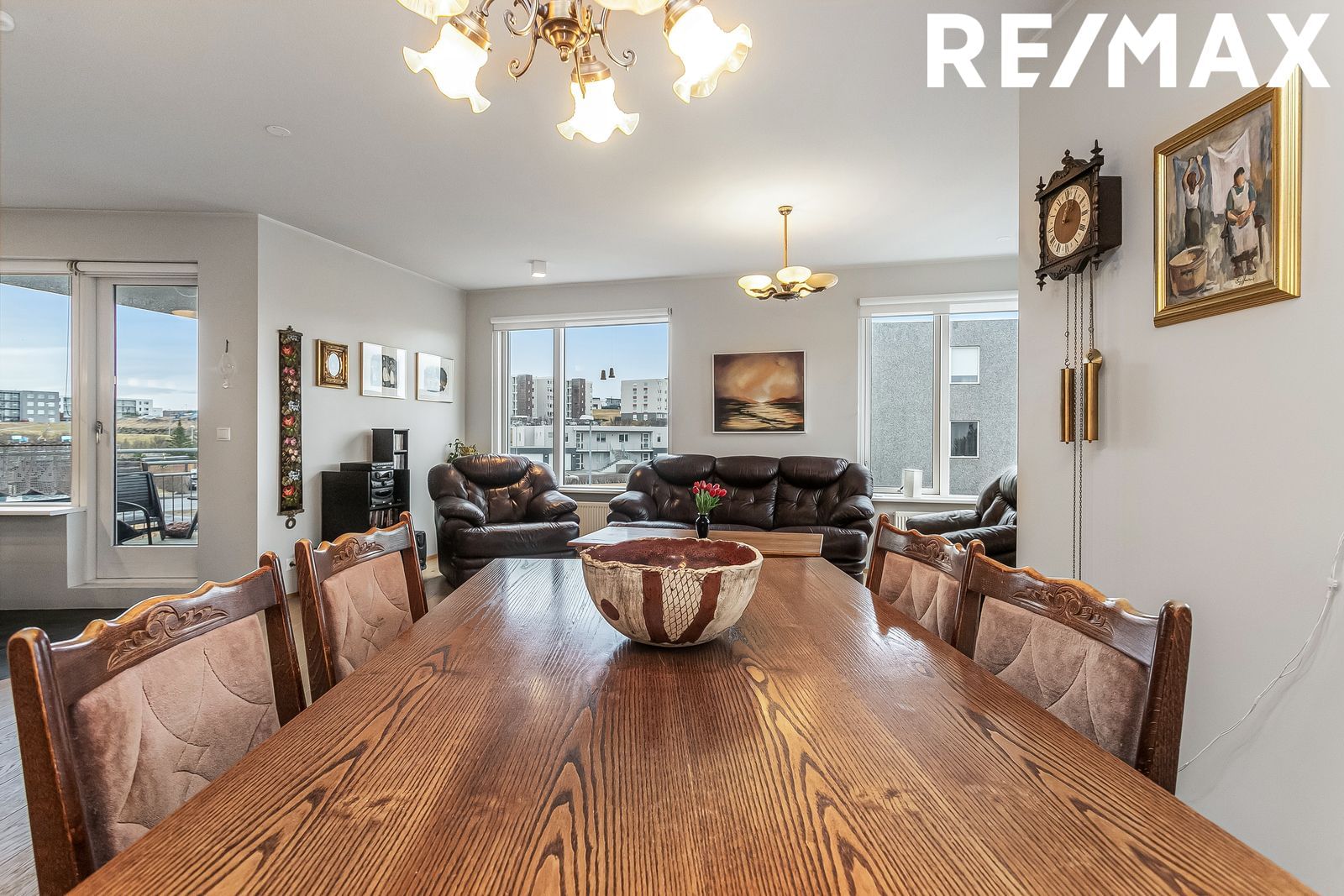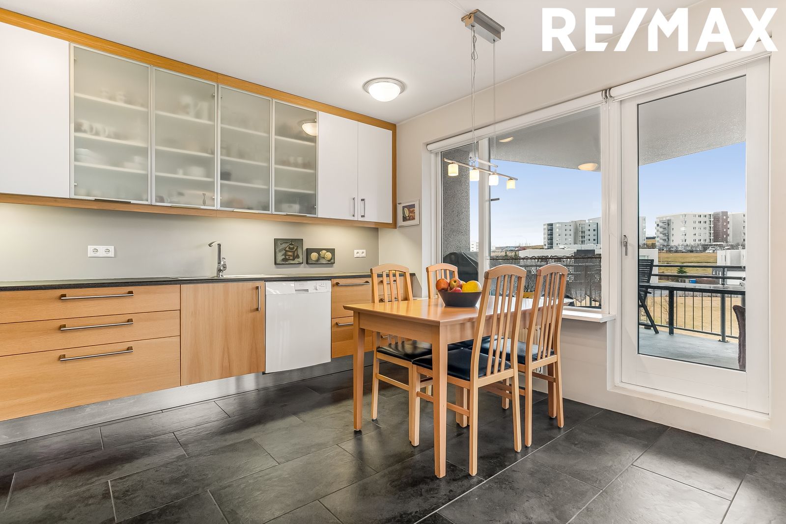 Eldhús: Rúmgott með flísar á gólfi. Viðarinnrétting, með hvíta efri skápa. Bakaraofn í vinnuhæð. Rýmið býður upp á að eyju sé bætt við. Útgengt út á 12,9 fm svalir.