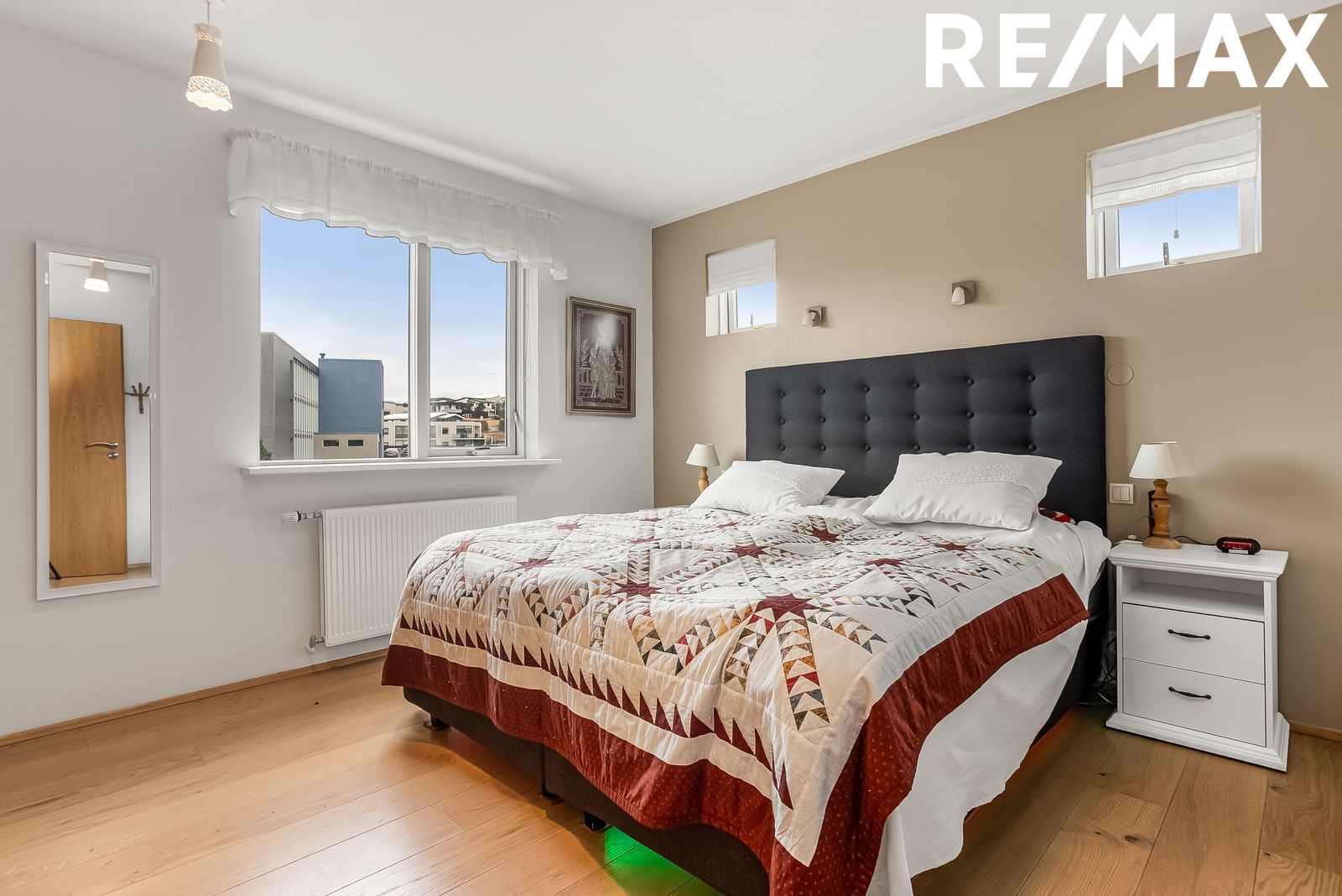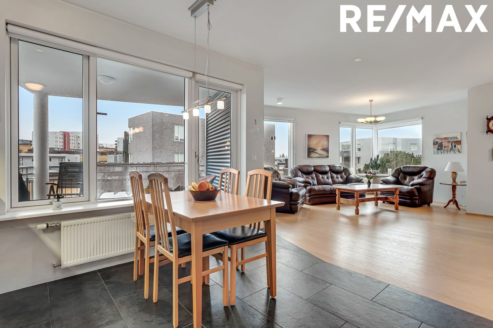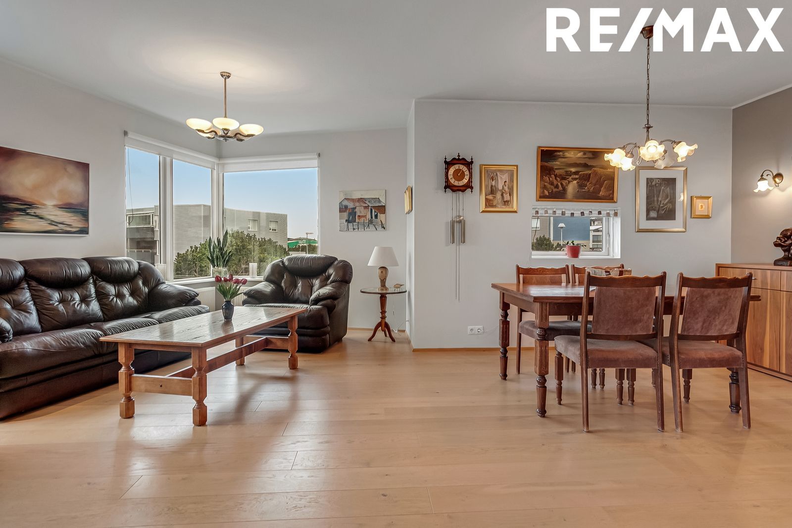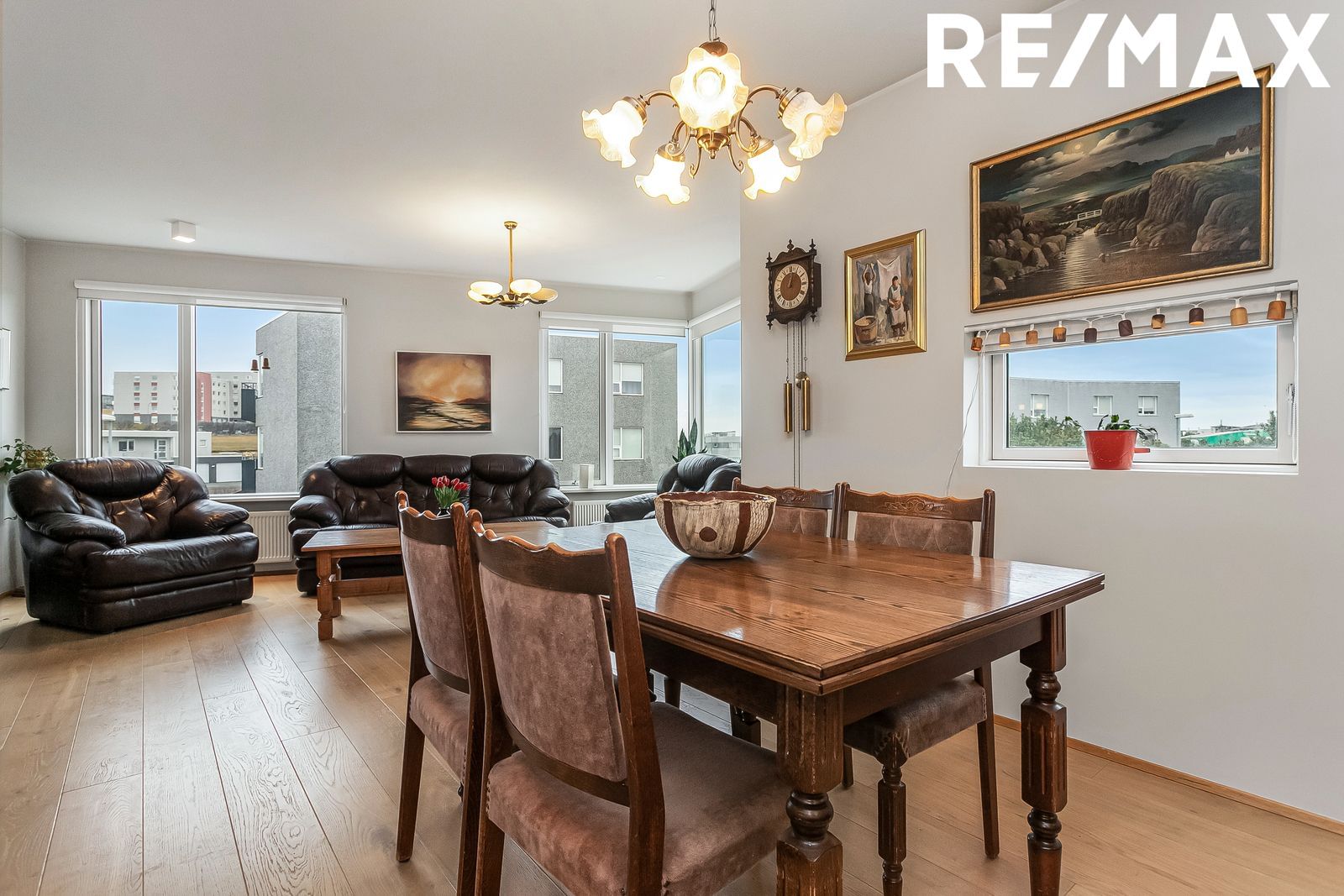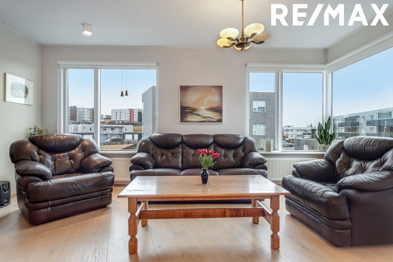 Eldhús: Rúmgott með flísar á gólfi. Viðarinnrétting, með hvíta efri skápa. Bakaraofn í vinnuhæð. Rýmið býður upp á að eyju sé bætt við. Útgengt út á 12,9 fm svalir.