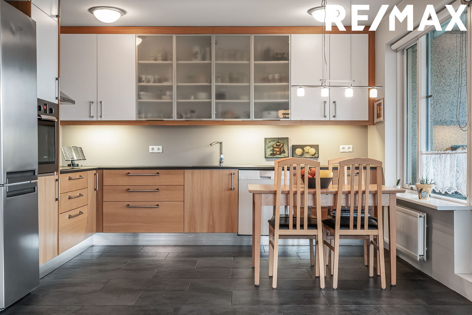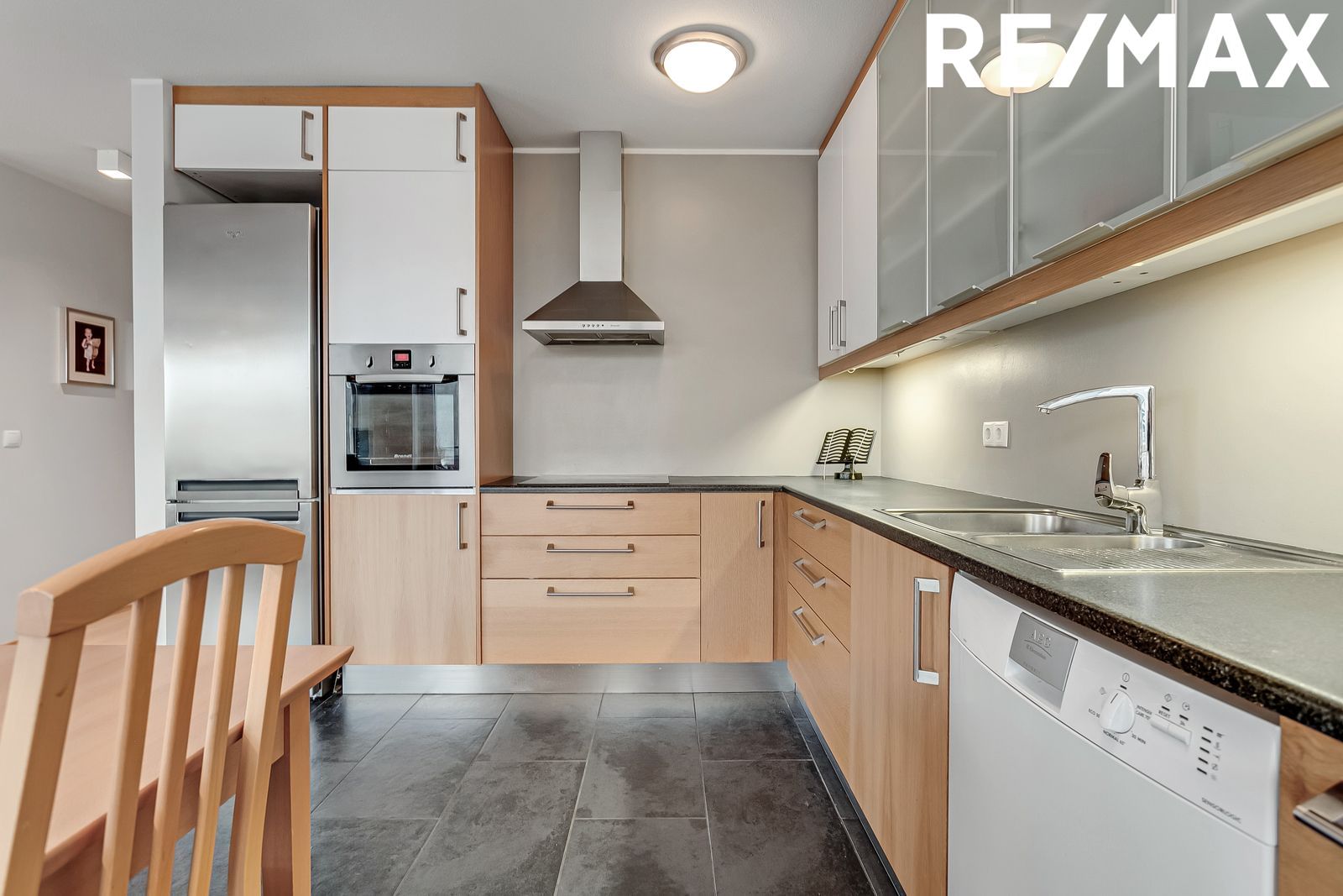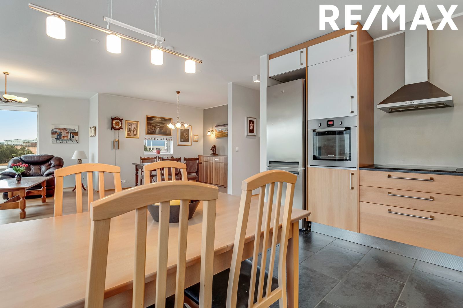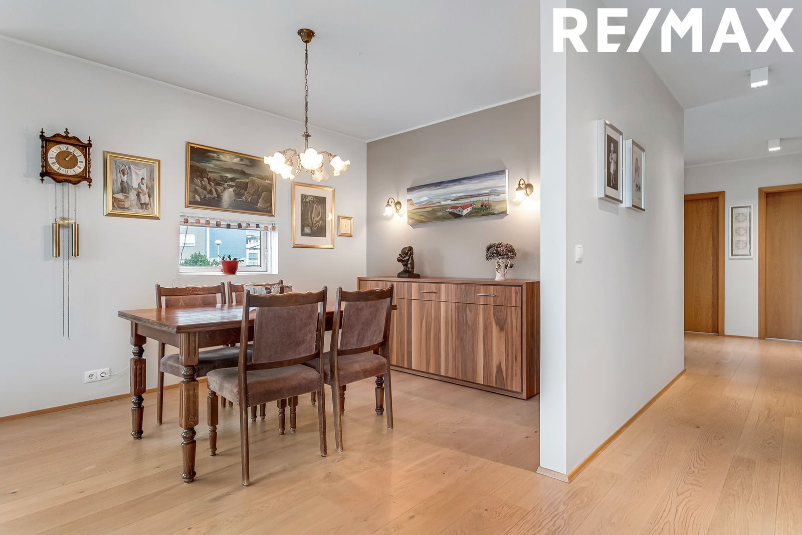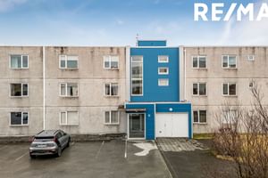 Eldhús: Rúmgott með flísar á gólfi. Viðarinnrétting, með hvíta efri skápa. Bakaraofn í vinnuhæð. Rýmið býður upp á að eyju sé bætt við. Útgengt út á 12,9 fm svalir.