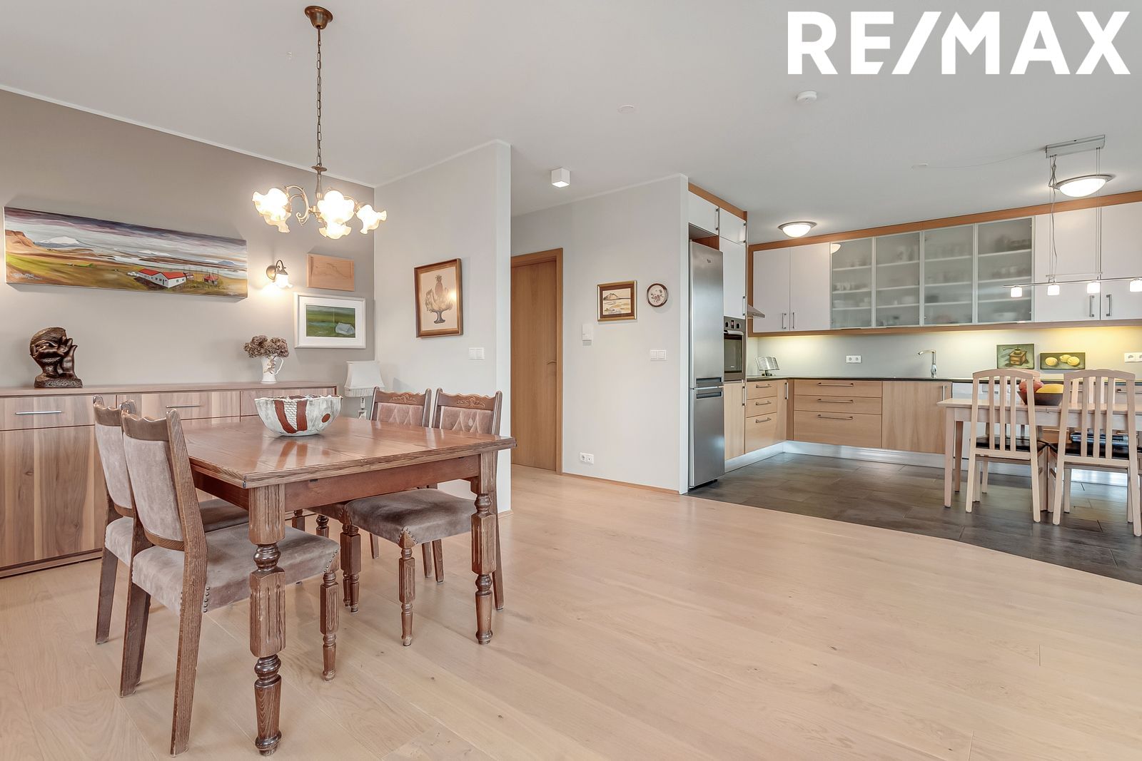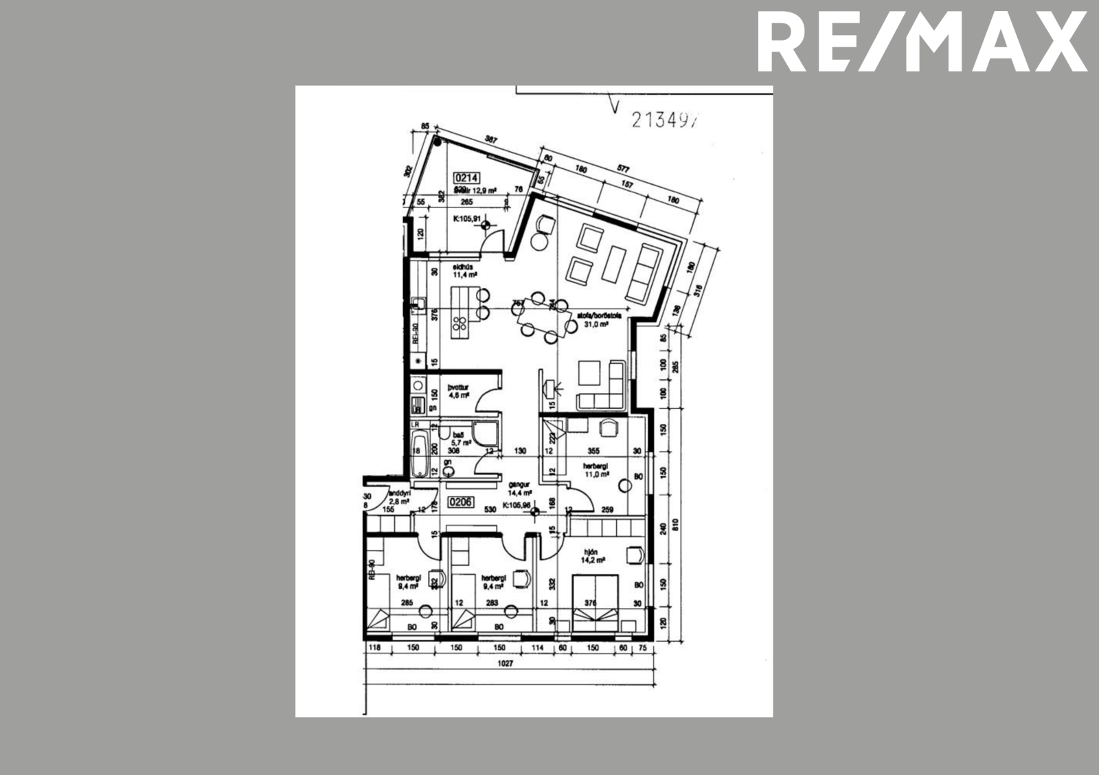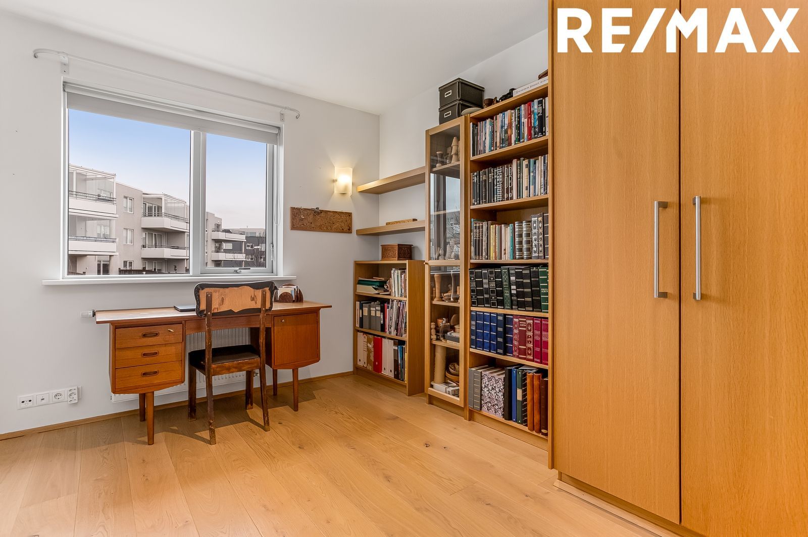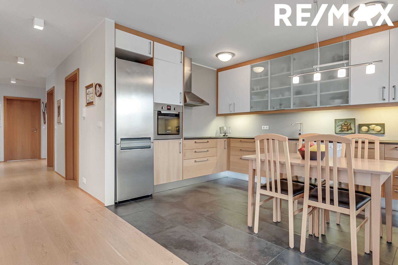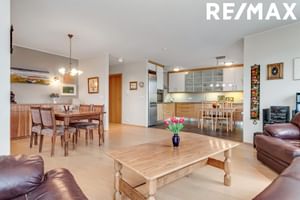 Eldhús: Rúmgott með flísar á gólfi. Viðarinnrétting, með hvíta efri skápa. Bakaraofn í vinnuhæð. Rýmið býður upp á að eyju sé bætt við. Útgengt út á 12,9 fm svalir.