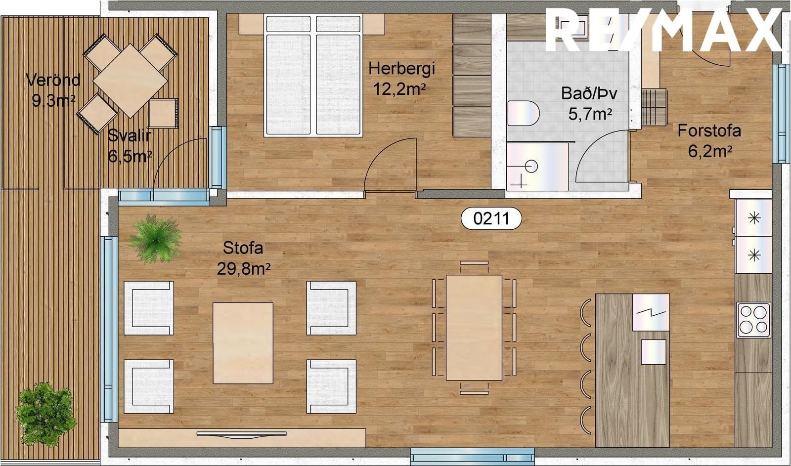 Stofa: er stór og björt úr stofu er útgengi út á 9,3 fm suð-vestur verönd, þar af eru svalir skráðar 6,5 fm. Útsýni yfir sameiginlegan garð hússins.