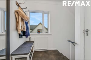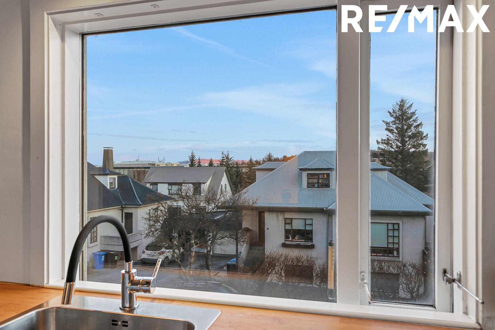 Um eign: Gengið er upp lokaðan stiga frá sameiginlegum inngang. Komið er upp á stigapall með góðu plássi til að hengja útiföt og geyma skó. Geymsla er á vinstri hönd áður en labbað er í íbúð. Komið er inn í forstofu með fatahengi. Gengið er inn í gang íbúðarinnar, hægra megin eru tvö svefnherbergi og til vinstri er baðherbergi og eldhús. Við enda gangs tekur við björt stofa og þriðja svefnherbergið.