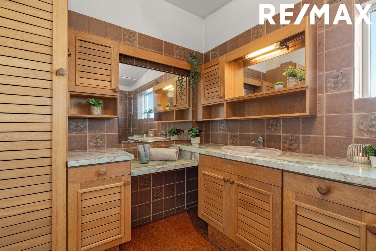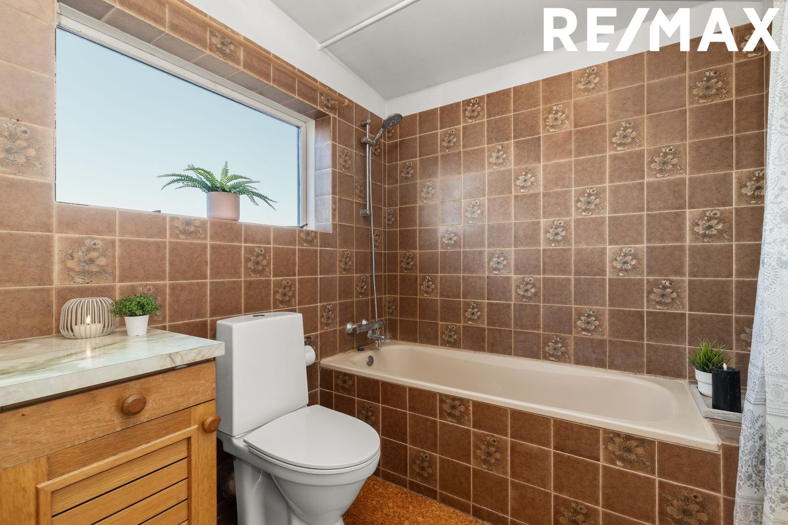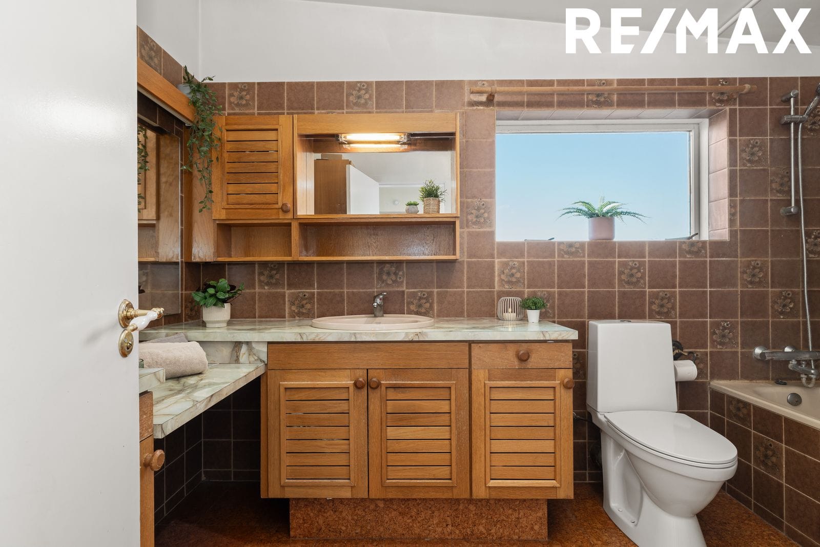 Baðherbergi: Flísalagt hólf í gólf, með brúnum flísum. Vegleg L-laga viðarinnrétting með miklu skápa og borðplássi með marmaraborðplötu. Speglar. Handlaug, Gólffest salerni. Baðkar með sturtuaðstöðu. Opnanlegur gluggi.
