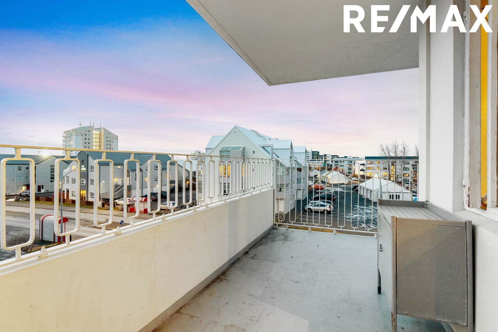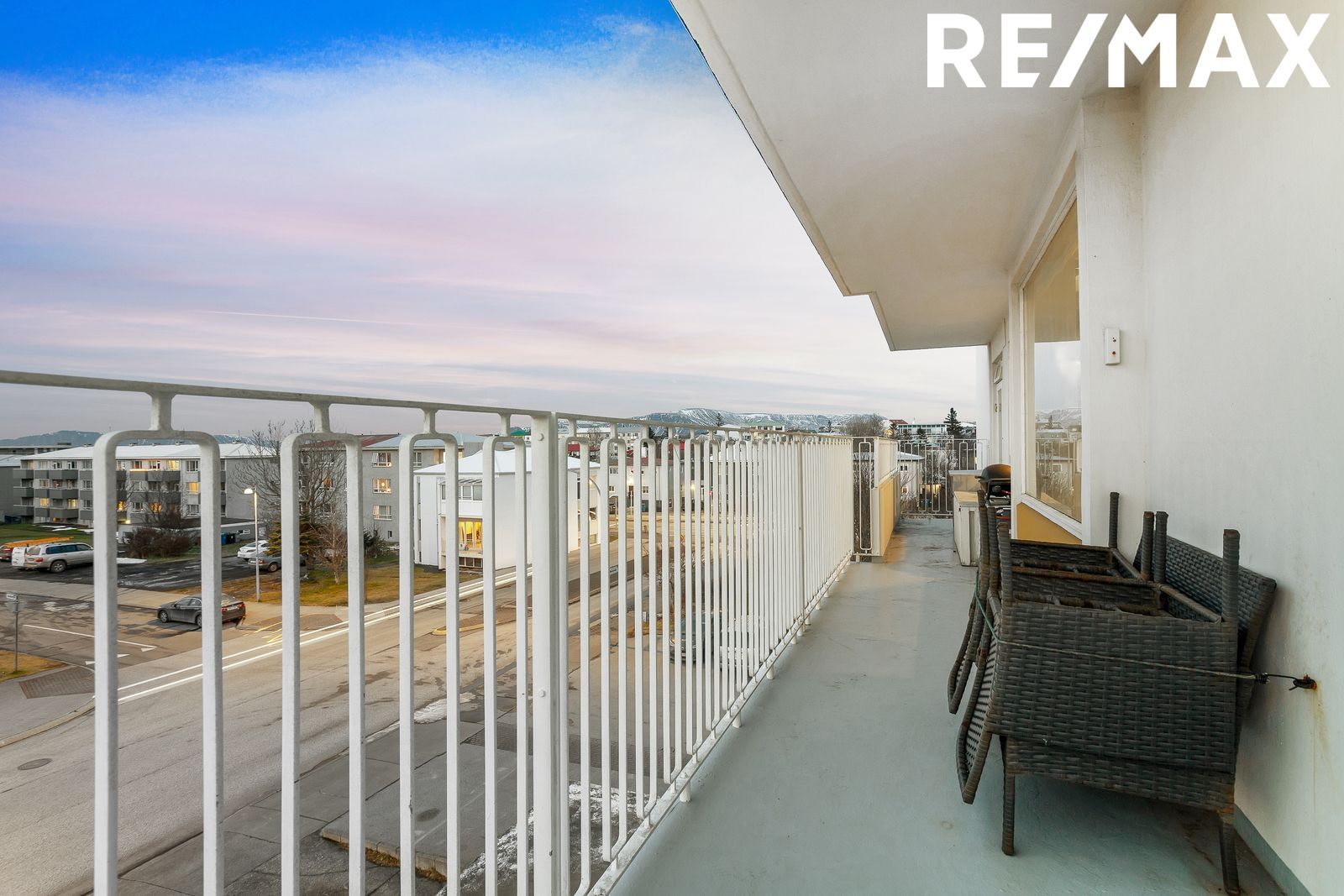 Eignin skiptist í anddyri, eldhús, bjarta stofu og borðstofu með útgengt út á 23 fm svalir, þrjú svefnherbergin, möguleiki að bæta við einu svefnherbergi á kostnað hluta af borðstofu, baðherbergi með glugga, góð innfelld þvottavélaaðstaða á svefnherbergisgangi og geymslu í sameign.