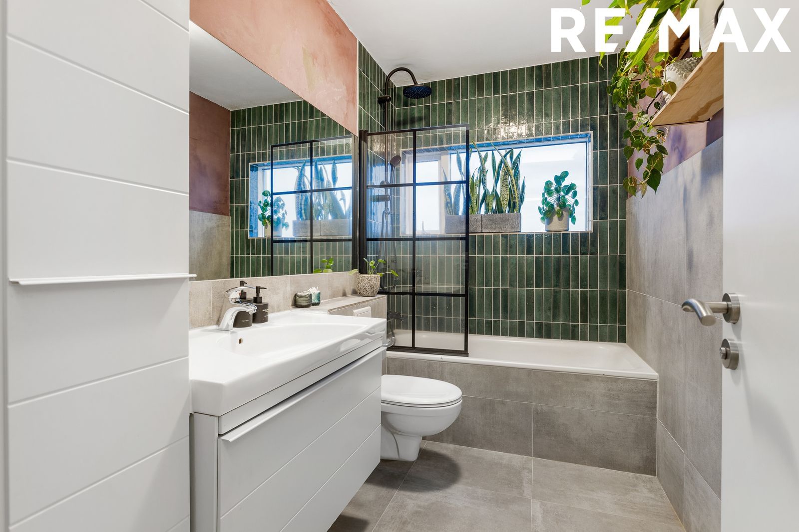 Baðherbergi: Flísar á gólfi og veggjum að hluta, baðkar með hertu glerskilrúmi, upphengt salerni, innrétting undir og við handlaug, stór spegill, gluggi.