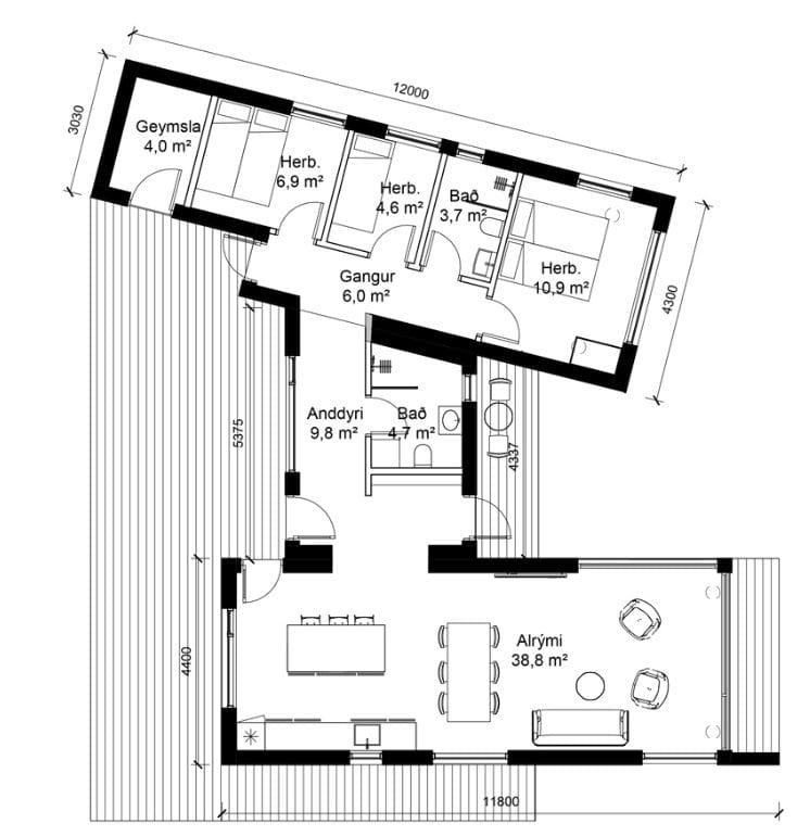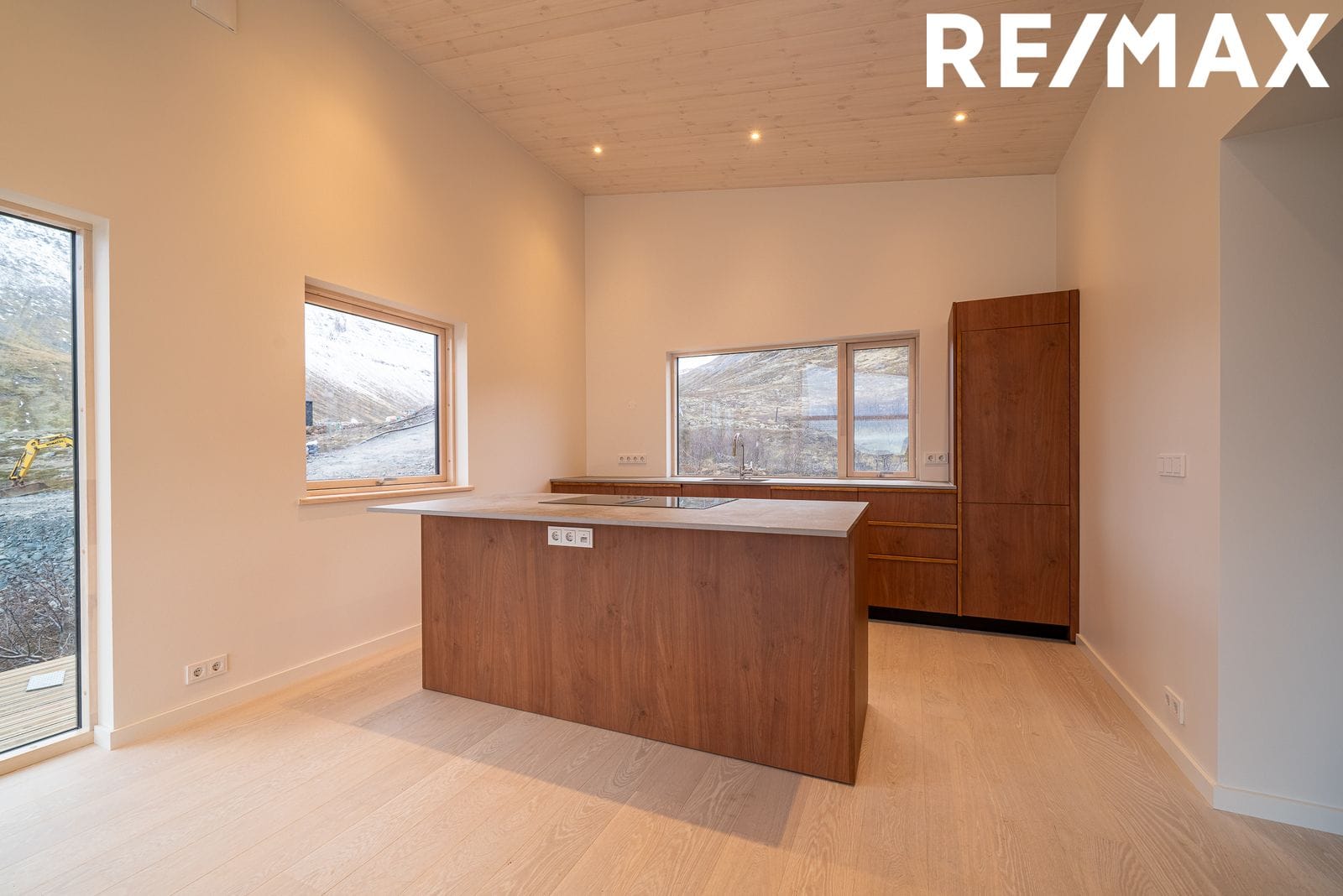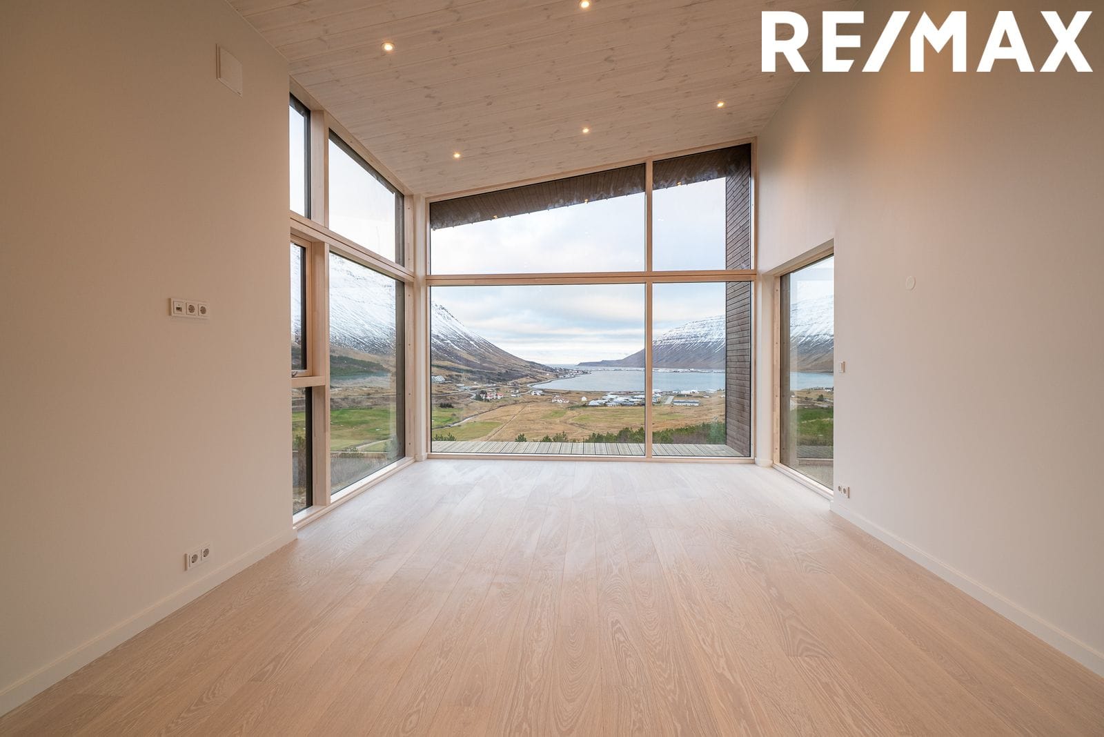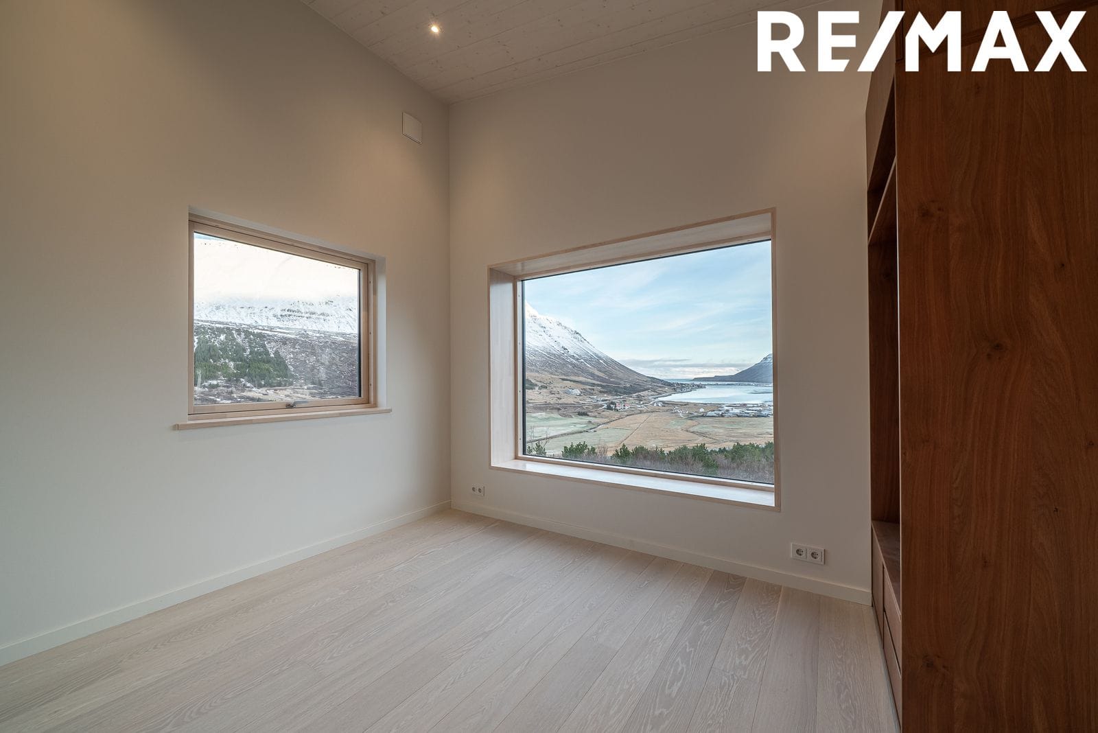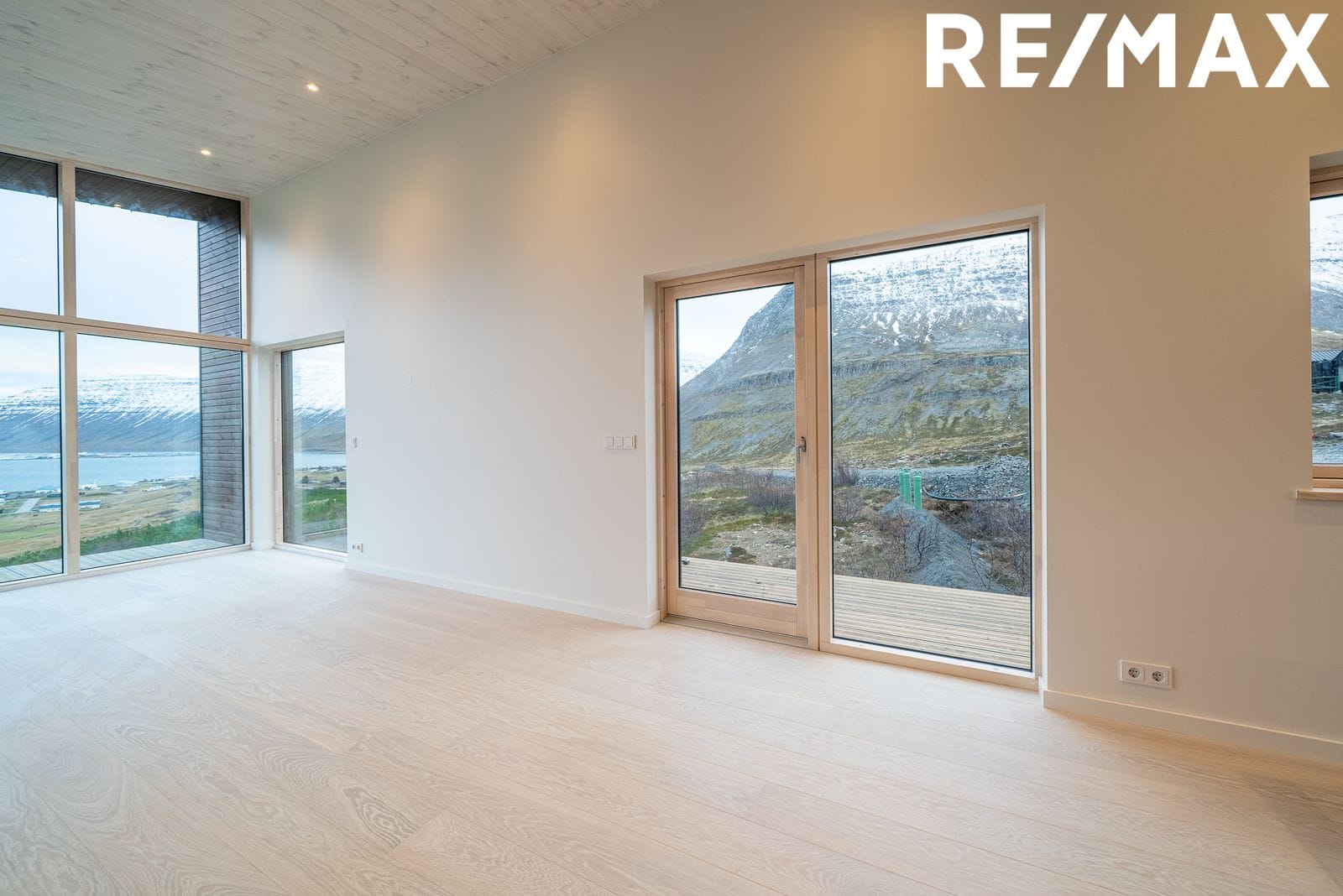 Byggingin er tvískipt. Komið er inn í bjart, flísalagt anddyri sem tengist beint rúmgóðu alrými, stofu og eldhúsi og til vinstri er svefnálma.