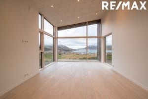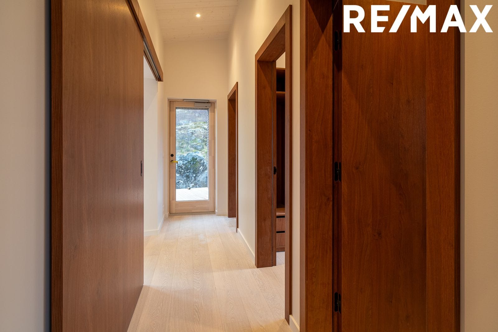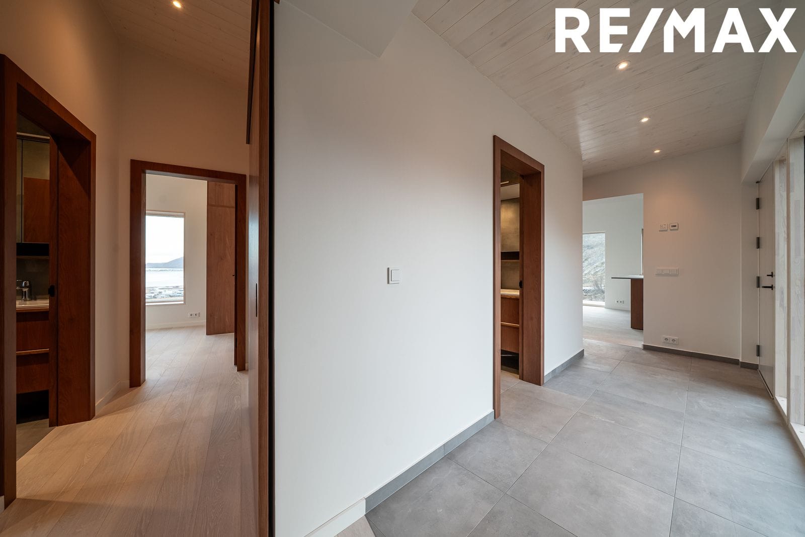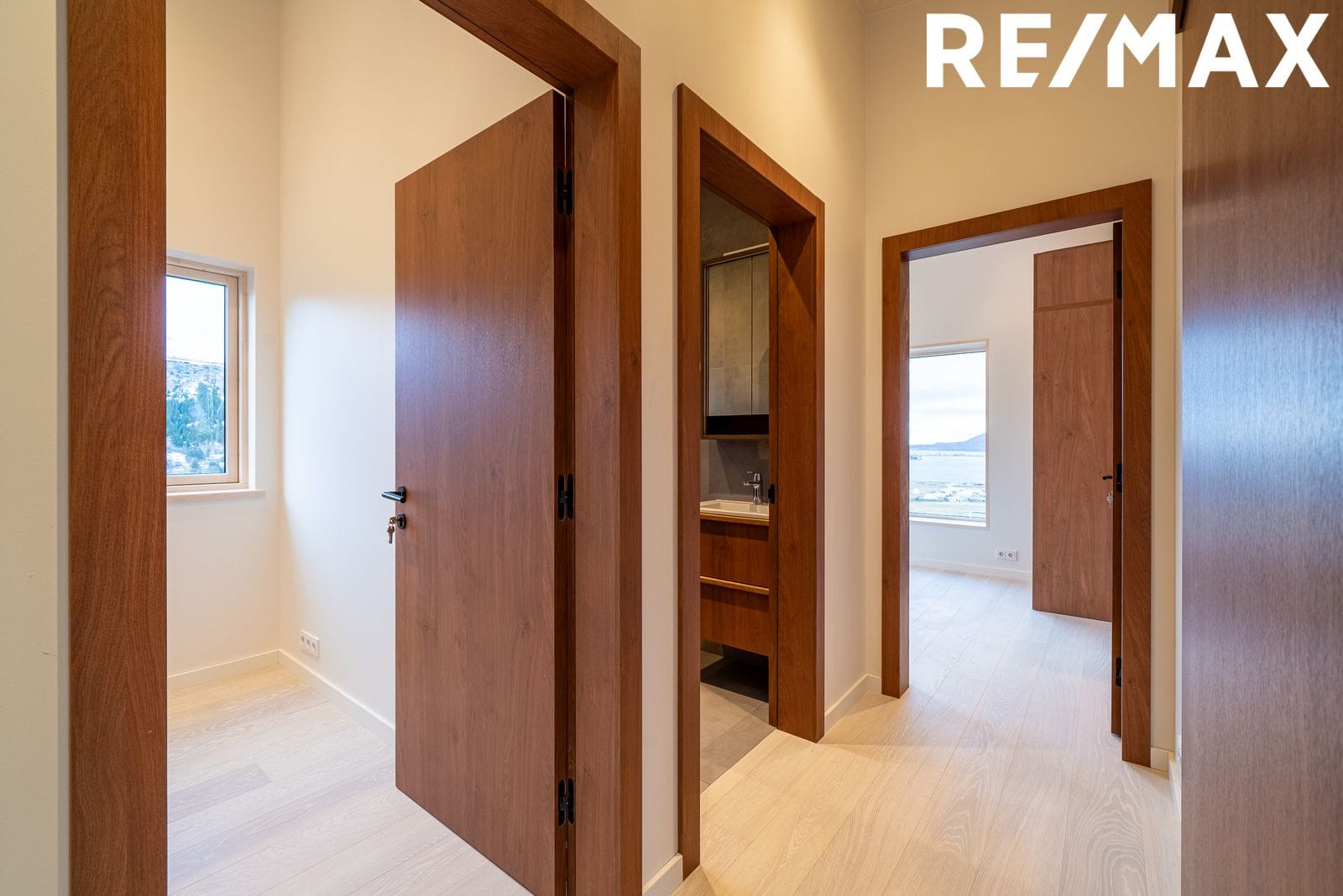 Allar innihurðir eru úr ljósum viðarspón. Veggir eru málaðir í ljósum lit (slétt yfirborð), loft klædd með hvíttuðu timbri og gólf með ljósu parketi. Útgengt er úr stofu út á sólpall.