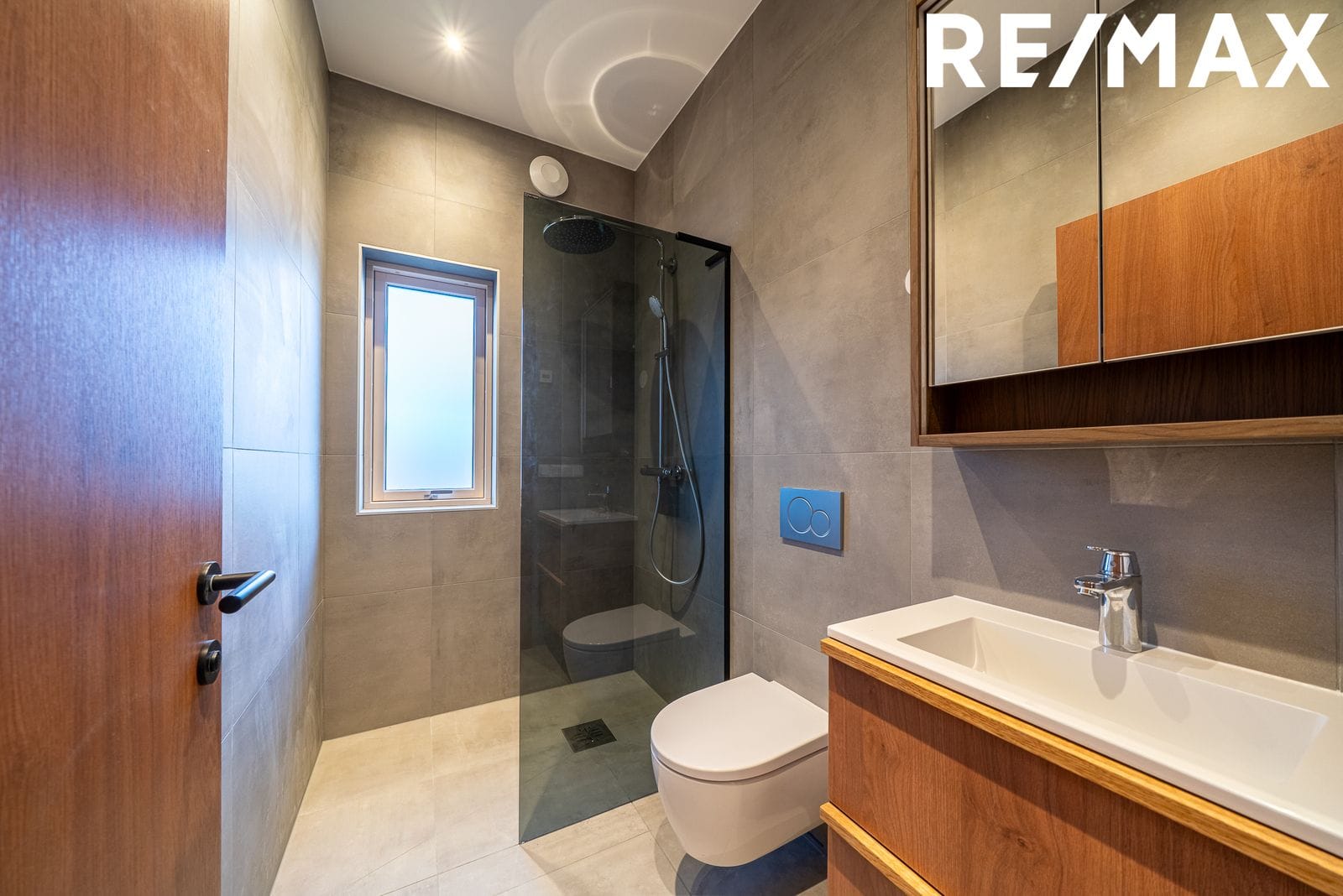 Baðherbergi er flísalagt á gólfi og veggjum, með vask í innréttingu, speglaskáp, vönduðum hreinlætistækjum og þreplaustri sturtu með sturtugleri.