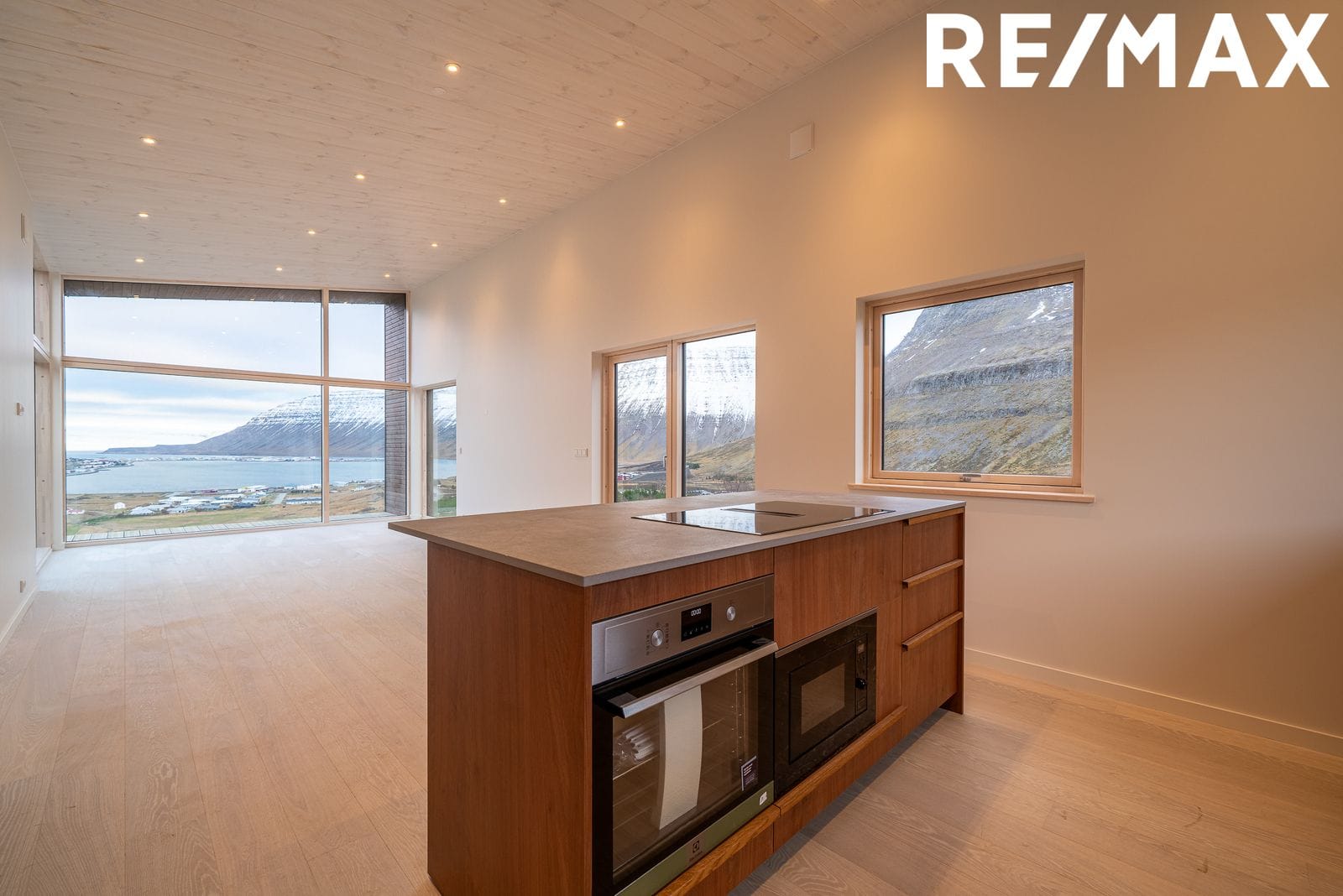 Alrými er bjart með stórum gluggum. Eldhús er með rúmgóðri ljósri spónlagðri innréttingu og vönduðum heimilistækjum: innbyggðum ísskáp, uppþvottavél, helluborði, ofni og örbylgjuofni.