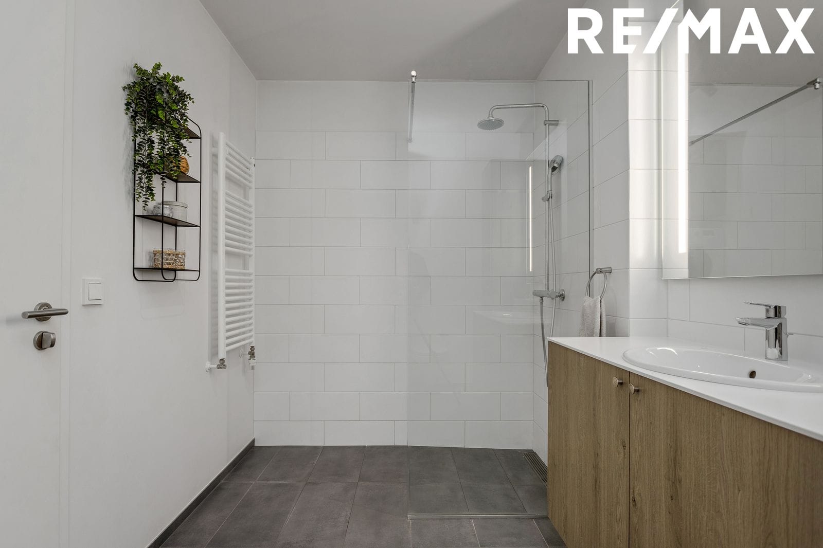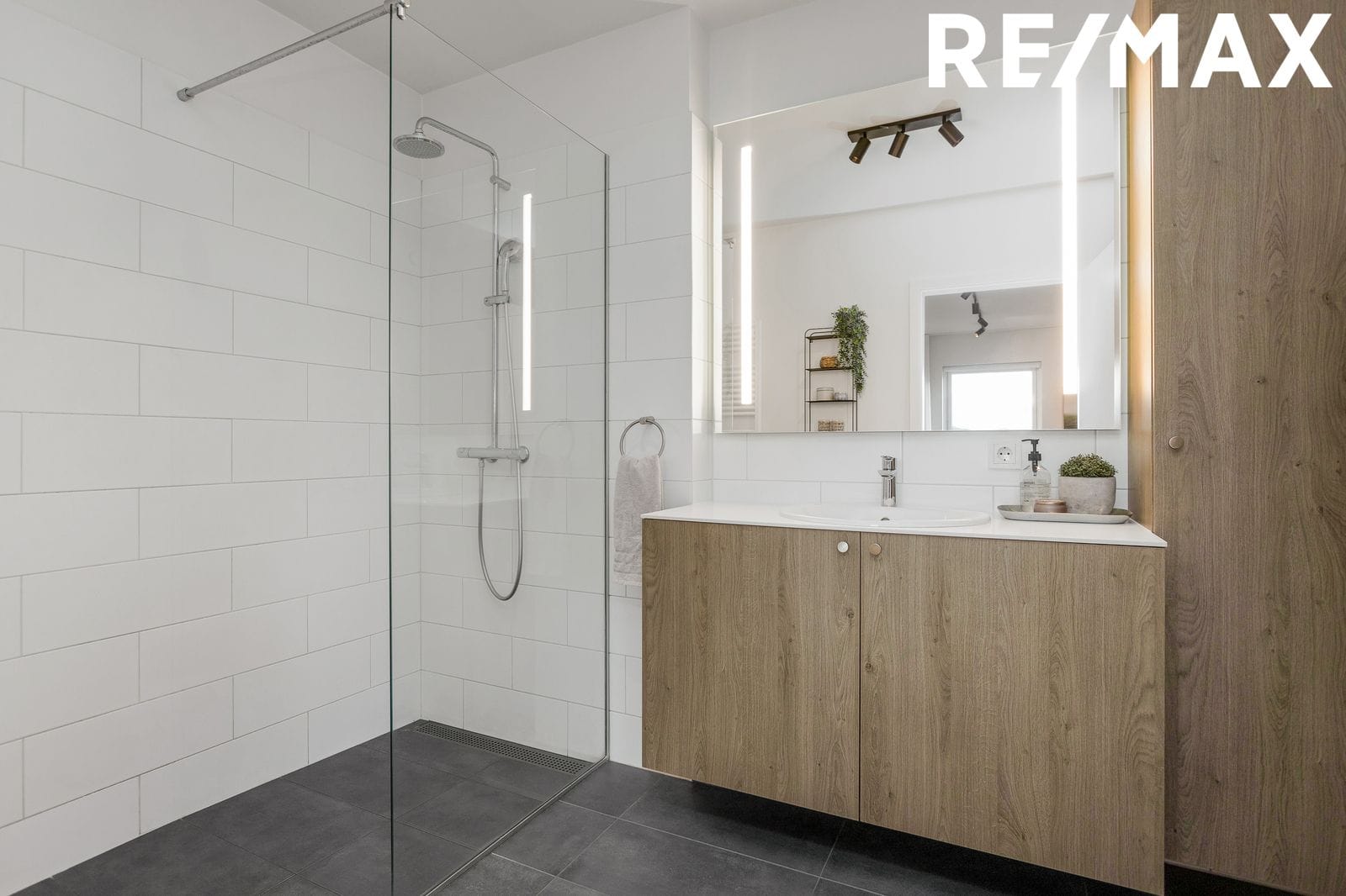 Baðherbergi er með flíslagt gólf og vegg að hluta. Falleg og stílhrein innrétting frá Formus. Spegill með innbyggðri lýsingu. Sturta er með hertu gleri og handklæðaofn. Salerni er vegghengt með vatnssparandi þrýstirofa, handlaug er í borði innréttingar með einnar handar blöndunartæki. Hitastýrð einnar handar blöndunartæki eru í sturtu.